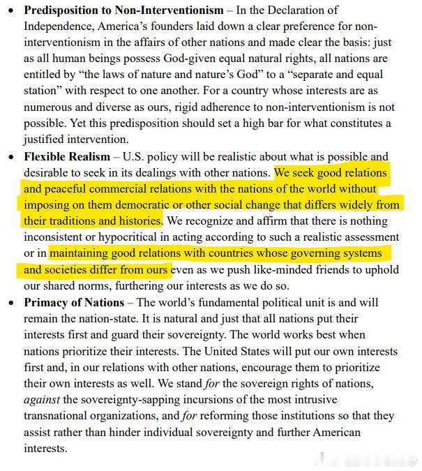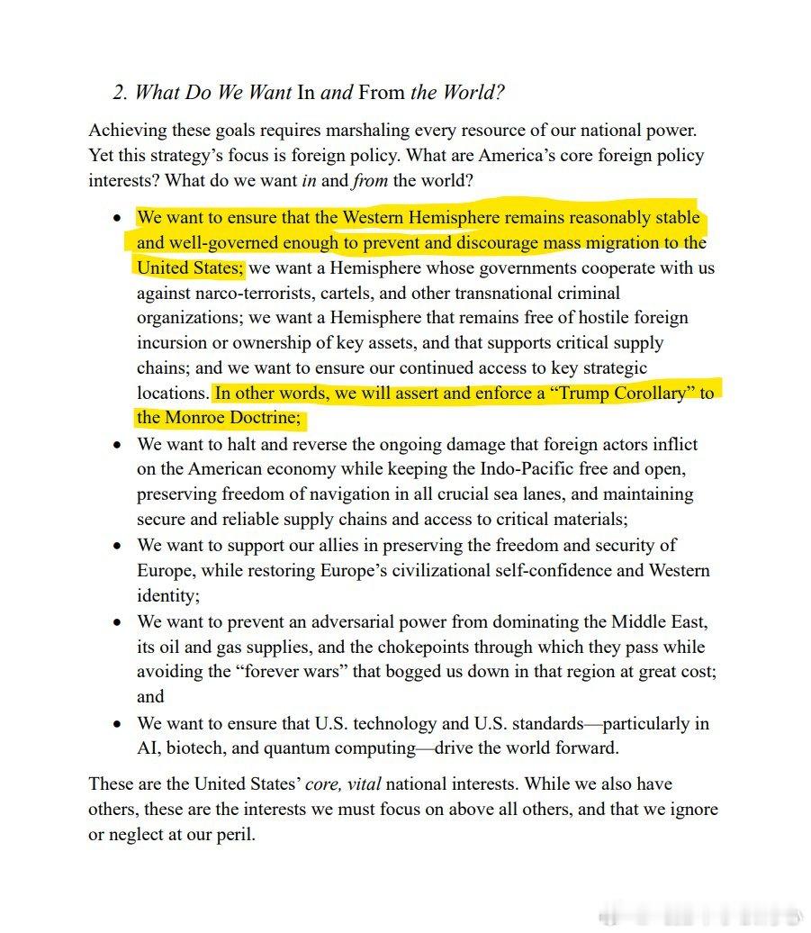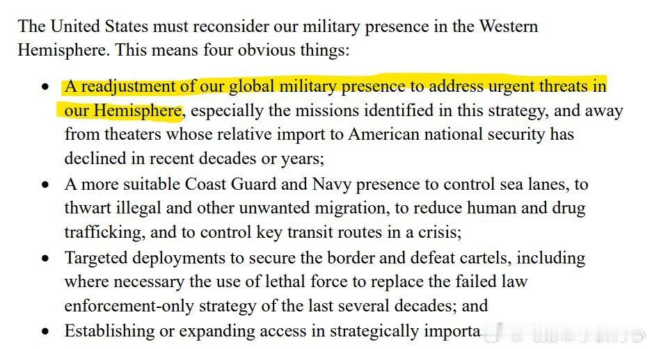 《美国国家安全战略》刚刚公布,老外的一篇评论:这件事很重大。最新版的《美国国家安全战略》刚刚公布,其中确认了美国战略重心将重新转向“西半球”(也就是整个美洲地区)。文件明确将此确立为美国的头号优先事项,并表示美国将“主张并执行对门罗主义的‘特朗普推论’(Trump Corollary)”。在军事部署方面,文件写道,这意味着:“重新调整美国的全球军事存在,以应对本半球的紧迫威胁,并从那些近几十年或近几年相对重要性下降的战区撤出力量。”关于中国,有几点值得注意。最突出的一点是:文件🔻不再把中国定义为“首要威胁”“最具影响的挑战”“主导性威胁”或过去文件中常见的类似表述。中国在美国战略中的优先级显然被下调了。从文件的结构与强调顺序来看,美国的主要优先事项大致可以归纳为:国土安全与边境安全(移民、贩毒集团等)西半球(恢复门罗主义)经济安全(再工业化、供应链)中国与印太地区需要说明的是,文件并没有把中国描述成盟友或伙伴,而主要视其为:经济竞争者供应链脆弱性的来源(但同时也是贸易伙伴)应“尽可能”阻止其取得地区主导地位的力量,因为这“对美国经济有重大影响”有趣的是,我认为这是美国首次在官方战略文件中提及自身可能被中国在军事上超越:文件写道:“阻止台海冲突,最好是通过保持军事优势(overmatch)来实现,这是一个优先事项。”其中“最好(ideally)”一词明确暗示:保持军事优势是理想情况,但并不一定能做到。同时把“阻止台海冲突”仅称为“一个优先事项”,也意味着它已经不再是美国的核心战略优先或“至关重要的国家利益”。在台湾问题上,文件还暗示,如果美国的“第一岛链盟国”不能“真正投入更多资金,更重要的是做出更多实际行动”,那么未来可能出现“对美国极为不利的力量对比,使得美国根本无法防卫那座岛”。文件仍然重申“美国不支持任何单方面改变台海现状”,但很明显,美国所声称反对的事,与其实际愿意为此付出的代价之间的距离正在拉大。另一个显著变化是:与此前文件不同,这份战略文件在中国问题上完全没有意识形态色彩。没有“民主对抗专制”的叙事,没有“维护以规则为基础的国际秩序”,没有价值观驱动的“使命式外交”。中国被视为一个需要“管理”的现实问题,而不是必须“击败”的意识形态敌人。事实上,文件甚至明确写道(我认为也是首次提及):美国政策“不再以传统政治意识形态为基础”美国寻求“与世界各国建立良好、和平的商业关系,不向它们强加与其传统与历史完全不同的民主或其他社会变革”美国寻求“与治理体系不同于美国的国家保持良好关系”这与过去几十年美国对外政策的传教式自由国际主义相比,可谓惊人的转变。我们早已知道趋势正在变化,但如今已经明明白白地写进了战略文件里:美国的使命式自由主义时代已正式终结。与此同时,美中竞争被完全描述为经济竞争。文件明确表示:“竞争的核心是赢得经济的未来”,“经济是最终的赌注。”值得注意的是,美国承认对中国加征关税的做法(始于2017年)基本失败,因为:“中国完成了适应”,并且“加强了其对供应链的掌控。”新的战略,如文件描述,是要建立一个针对中国的经济联盟,以便形成超过美国单独行动的杠杆——这等于默许美国自身力量不足以单独与中国竞争。矛盾之处也显而易见:一边要建立对华经济联盟,一边却对联盟伙伴打贸易战、要求它们承担更多防务开支、并把每段盟友关系当成必须重新谈判的商业合同。到了某个时刻,这些“盟友”难免会问出那个显而易见的问题:为什么要牺牲我们的经济利益,只为了扶持一个已经无法独自竞争、并且给予我们回报越来越少的美国?烽火问鼎计划飞扬军事热点观点 老外网友的一家之言,不过《美国国家安全战略》到底定了什么调子,建议去看原文。