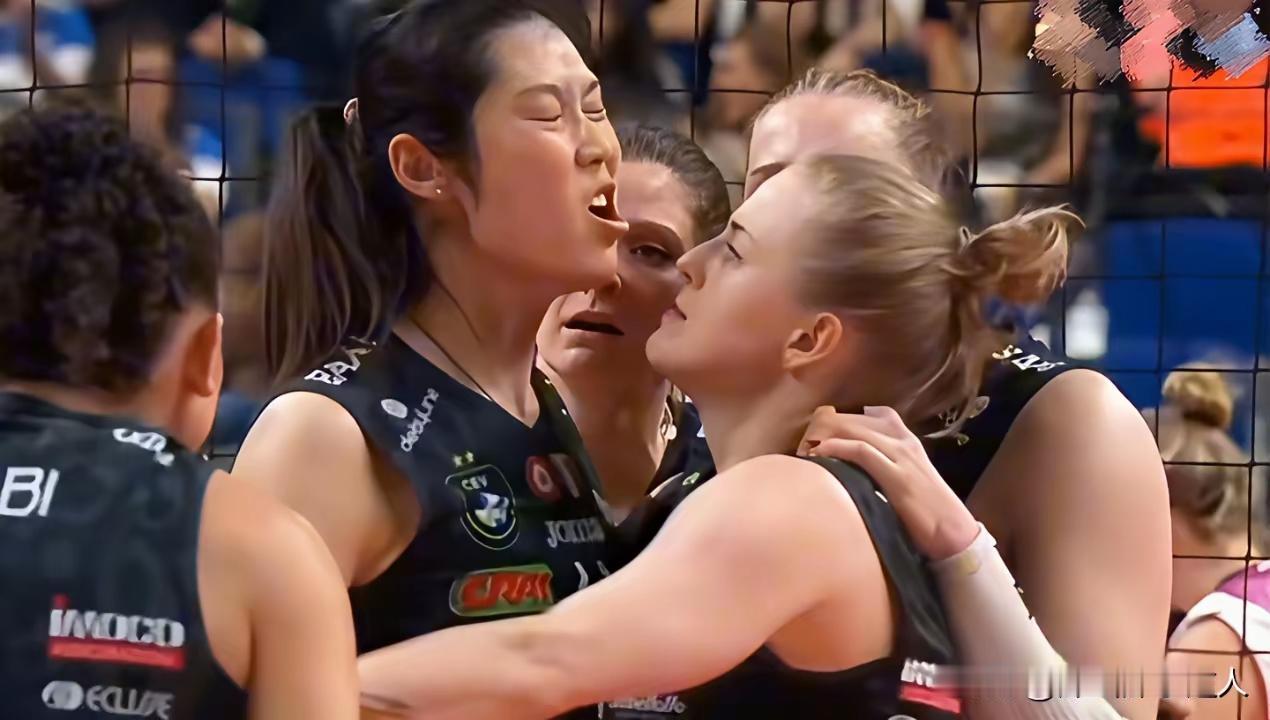 以为两个队员发成了冲突,另一个队员在拉架,一看说明是球队在庆祝胜率,这两人的表情,就是要干仗啊,朱婷也太搞笑了!