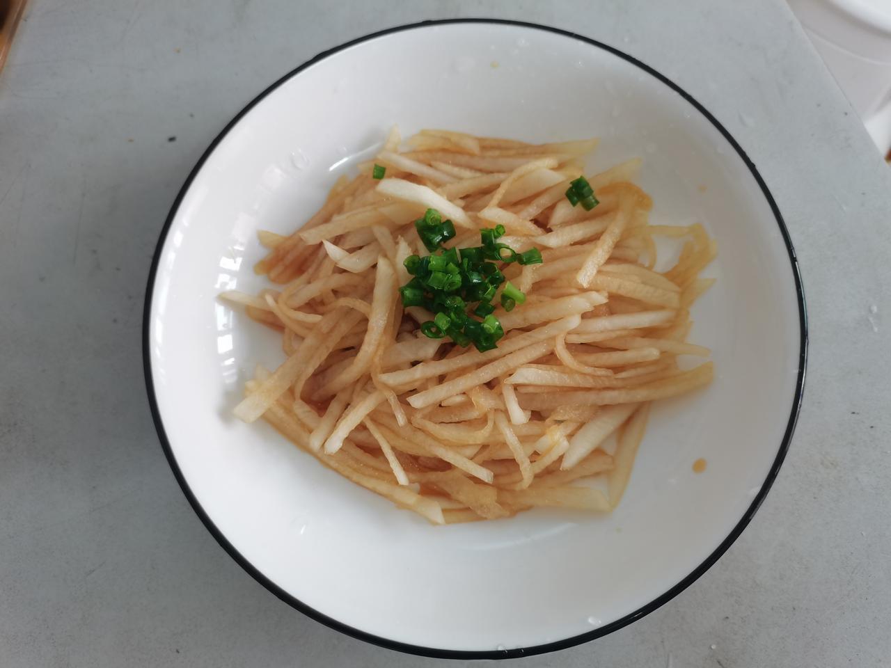 冬吃萝卜夏吃姜,糖醋萝卜真的香,周末盘点加班,真的不知道吃些什么,看到冰箱里还有一个安静的白萝卜。 拿出白萝卜去皮后切成薄片,再切成细条,来点白糖、香醋、再来点生抽,水嫩水嫩的白萝卜,用筷子拌几下,来几颗小葱点缀一下,一碗绿豆粥,一碟糖醋萝卜,久违的味道。