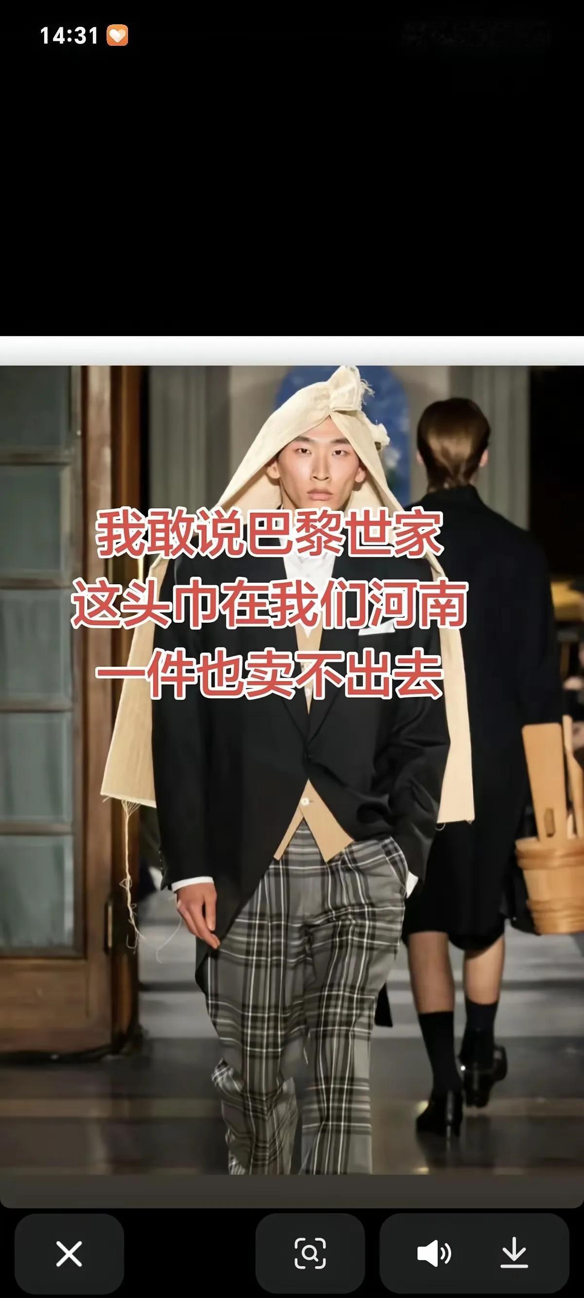 这款巴黎世家 总是会带上河南 为什么要连上河南两个字呢?是要把河南带火吗? 这头巾就是孝帽子,原装的没有任何改动,不要说在河南一个也卖不出去。 这就是在河北,山东区域谁敢戴这么一个头巾,也会把老人气的病倒。 我老公对我说,他严重怀疑这个设计师是咱们北方人出去的。才有这样的设计灵感。一般人不会有这样的灵感的。 好在一点巴黎世家不坑穷人,穷人也买不起啊。