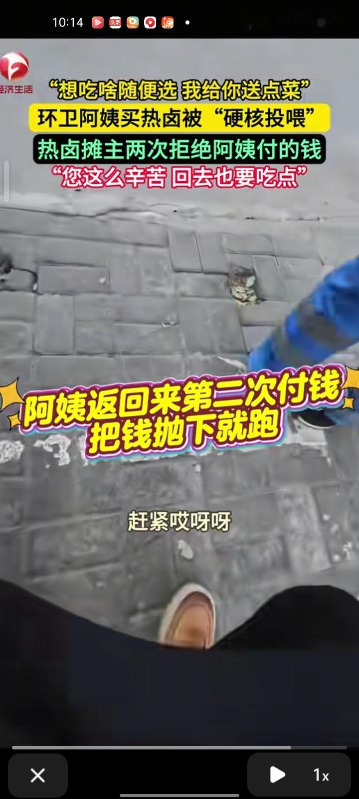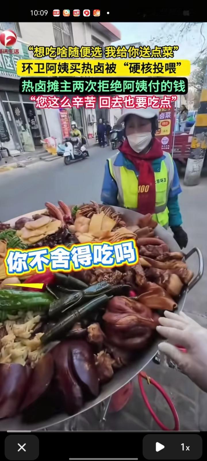 近日,甘肃天水。小伙在街上摆摊卖热卤看到一位环卫阿姨徘徊半天了不敢多选菜,她说自己舍不得吃要给孩子买一点回去,小伙决定让阿姨选菜,切好后装袋拿给她。第一次阿姨要付钱被小伙拒绝,阿姨坚持要给,两人发生拉扯。第二次阿姨第二次返回付钱后撒腿就跑,小伙追上后把钱给她塞回去了。