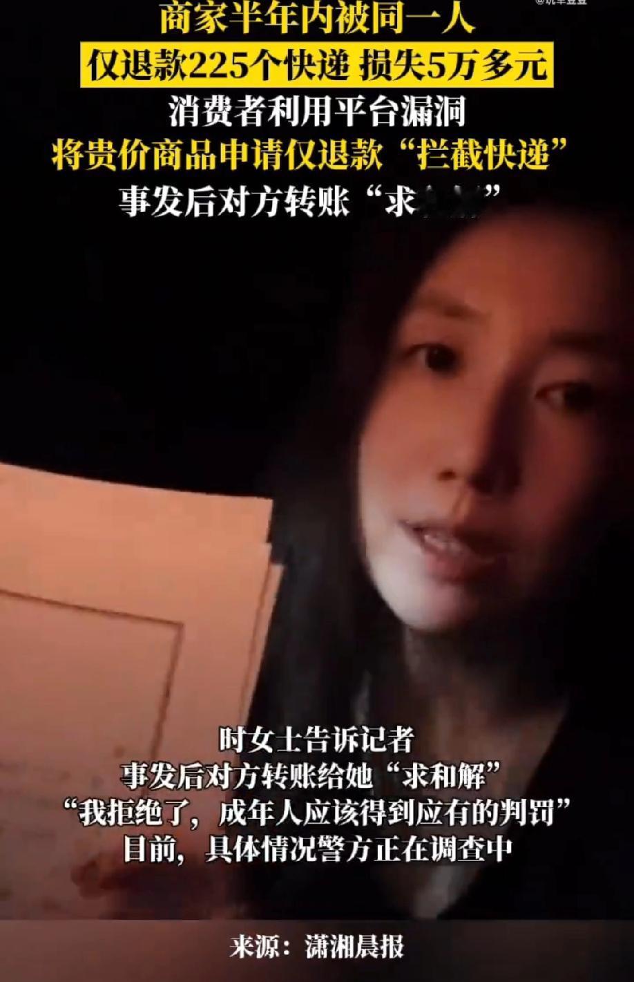 现实版“怪盗基德”,使用组合下单+拦截掉包的方式,调换面单,偷梁换柱,半年调包225件,快递净赚5万,这是天天薅羊毛,还是逮住一只可劲得薅啊! 事情败露后,刘女士事后主动联系商家转账试图"私了",这是摸准了商家维权要花时间、精力,大概率会息事宁人,这种“吃定商家弱势”的嚣张,才是白嫖行为的真正底气。 没想到这回踢到铁板了,商家拒绝和解并报警,强调"成年人应为行为负责"。警方已刑事立案,损失金额暂定为5万余元。 可能受害者还不止一家,支持商家维权,这行为就是利用平台规则实施赤裸裸的诈骗! 仅退款的初衷本来是为了保障消费者权益,却成为了别有用心之人谋利的工具。把商家的信任当成掠夺的工具,这种为了利益而丧失信用甚至违法乱纪的行为必须严惩。