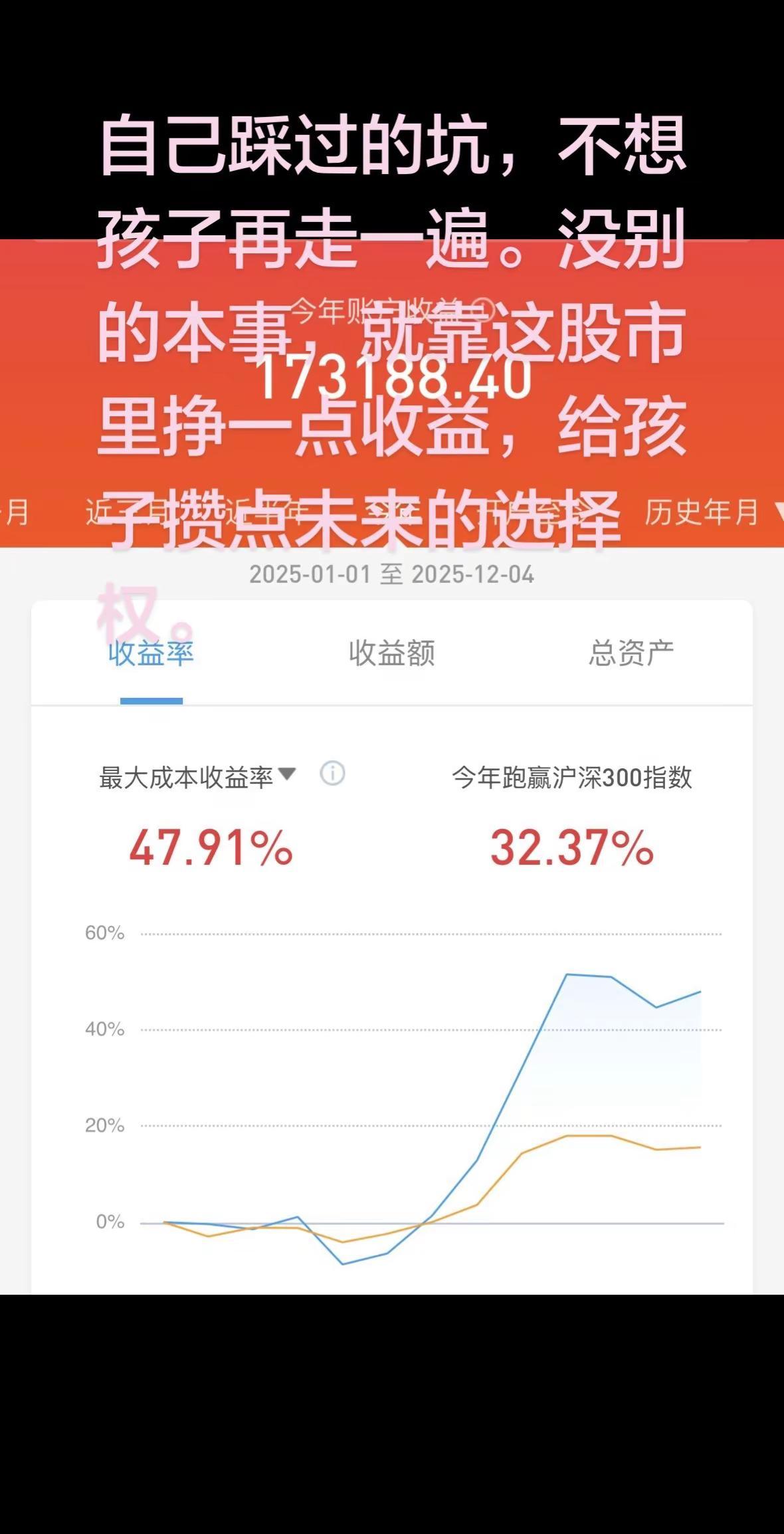 自己踩过的坑,不想孩子再走一遍。没别的本事,就靠这股市里挣一点收益,给孩子攒点未来的选择权。