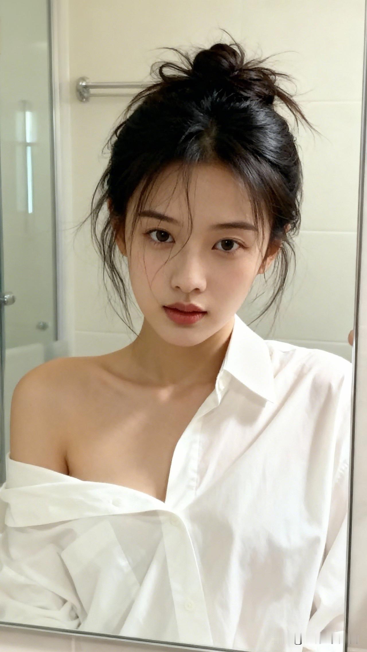 镜中人影,似水流年。穿白衬衫街拍,怎样搭配好看又时尚 慵懒的早晨,凌乱的丸子头,白色衬衫的清新,镜子里的自己。
