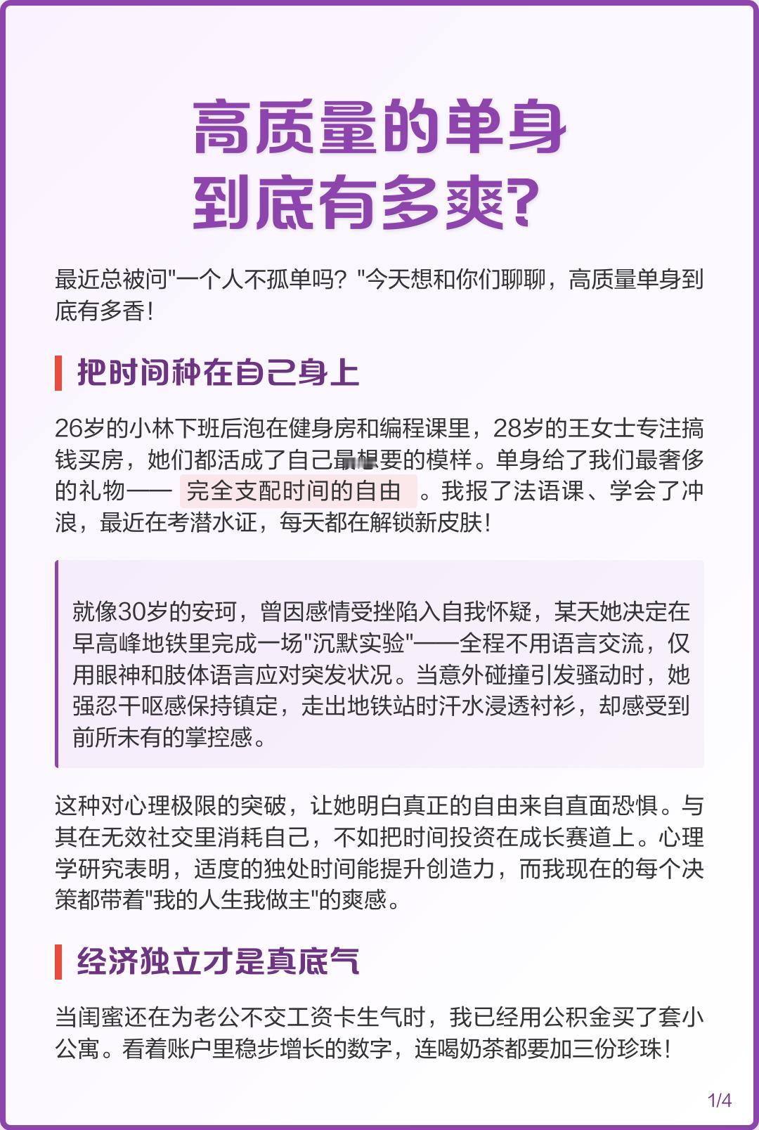 单身女性真的能有多爽?她们如何定义自己的快乐与自由? 在当今社会,越来越多的女性选择单身而非传统的婚姻生活。她们认为单身生活不仅带来经济上的独立,还能享受到个人自由与精神上的愉悦。单身女性们在职场上更加自信,在社交中更加从容,甚至有些人找到了比爱情更持久的快乐。例如,一位38岁的独居女性过着简单而通透的生活,她享受着独处的乐趣,花钱谨慎,生活轻松。另一位中年女性则因专注于事业和自我成长而选择单身,她认为婚姻并不总是如想象般美好。此外,一些女性认为单身生活减少了不必要的压力和责任,可以随心所欲地追求个人兴趣和目标。单身女性的快乐来源于对自己生活的掌控,而不是外界的压力和期待。 单身女人幸福感 单身独居女人 单身生活观念