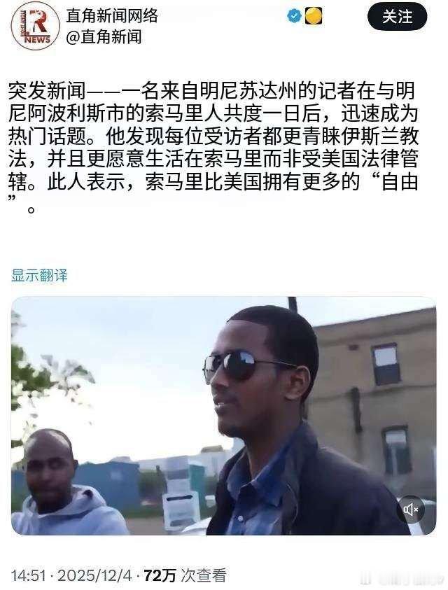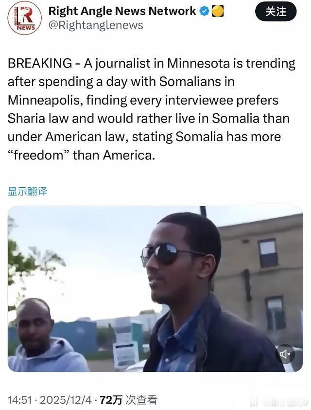 美国明尼苏达州一名记者在明尼阿波利斯与索马里人共度一天后成为热议话题。他发现,每位受访者都更喜欢伊斯兰教法,宁愿生活在索马里也不愿生活在美国法律之下,并表示索马里比美国拥有更多的“自由”