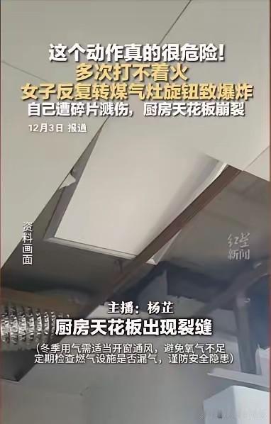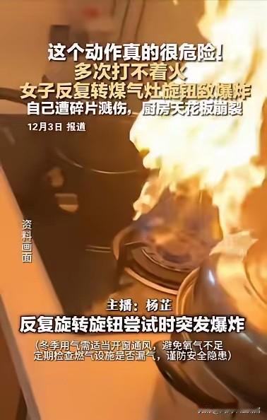 “悲剧还是发生了!”近日,江苏,一女子在家做饭时,煤气灶多次打不着火,她反复尝试旋转按钮点火,结果突然发生了爆炸,腿部被飞溅的碎片划伤,天花板也出现裂缝,吊顶脱落,厨房被彻底损坏。网友:没有常识吗? 田女士本想做顿饭,煤气灶怎么都点不着,她心里一急,连着扭了好几次打火开关。就是这个动作,闯了大祸。点不着火的时候,其实燃气已经悄悄漏出来了,在厨房空气里飘散。一次两次打火没成功,泄漏的燃气浓度越来越高,最后遇到明火,瞬间就爆燃了。民警赶到后,赶紧开窗通风,关上燃气总阀,给田女士简单处理了伤口,等120来把她送去医院。 燃气爆燃需要三个条件同时凑在一起——有燃料(燃气)、有助燃的空气(氧气),并且混合气体达到了能爆炸的浓度,最后还要有个点火源。反复点火,正好促成了最危险的那个组合。 家里燃气点不着,千万别不停地试。最要紧的是马上开窗通风,让可能漏出来的燃气散掉。然后关闭灶前阀和灶具阀门。如果总是打不着,就得联系专业人员来检查修理了。 国家规定,家用燃气灶的判废年限是8年,超期服役的老灶具,零件老化磨损,更容易出问题,比如漏气或者燃烧不完全产生有害气体。 定期检查连接灶具的软管,普通的橡胶软管容易老化,还可能被老鼠咬破。现在更推荐使用金属波纹管,它更耐腐蚀,还能防老鼠啃咬,安全系数高很多。 厨房安全没小事,一个错误的操作可能就会导致严重后果。了解基本的燃气安全常识,养成“用气勿离人、用完关阀门、定期查泄漏”的好习惯,才能守护好我们和家人的平安。 各位读者你们怎么看?欢迎在评论区讨论。