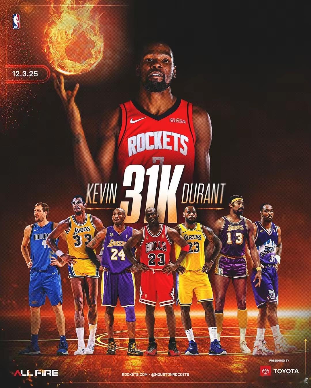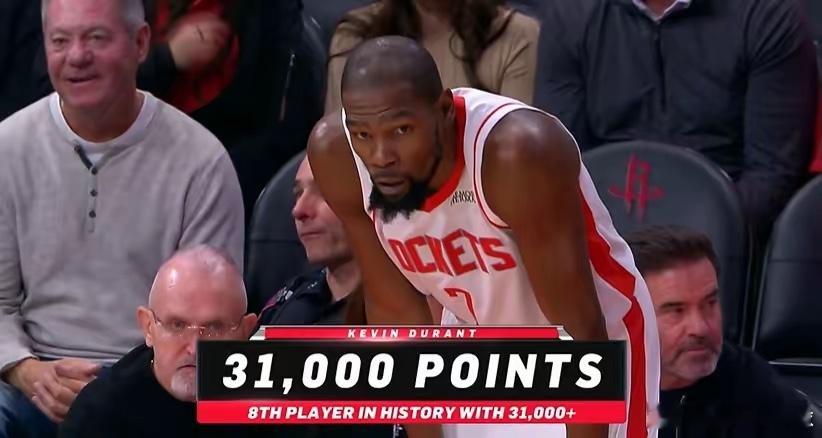 太阳vs火箭杜兰特又创造历史!火箭与太阳激战正酣!杜兰特得到本场第4分,个人生涯得分突破31000分大关,成为NBA历史上第8位得分破31000的球员(常规赛)!NBA历史得分前七位大神是:1、勒布朗·詹姆斯——42268分2、贾巴尔——38387分3、卡尔·马龙——36928分4、科比·布莱恩特——33463分5、迈尔克·乔丹——32292分6、德克·诺维斯基——31560分7、威尔逊·张伯伦——31419分