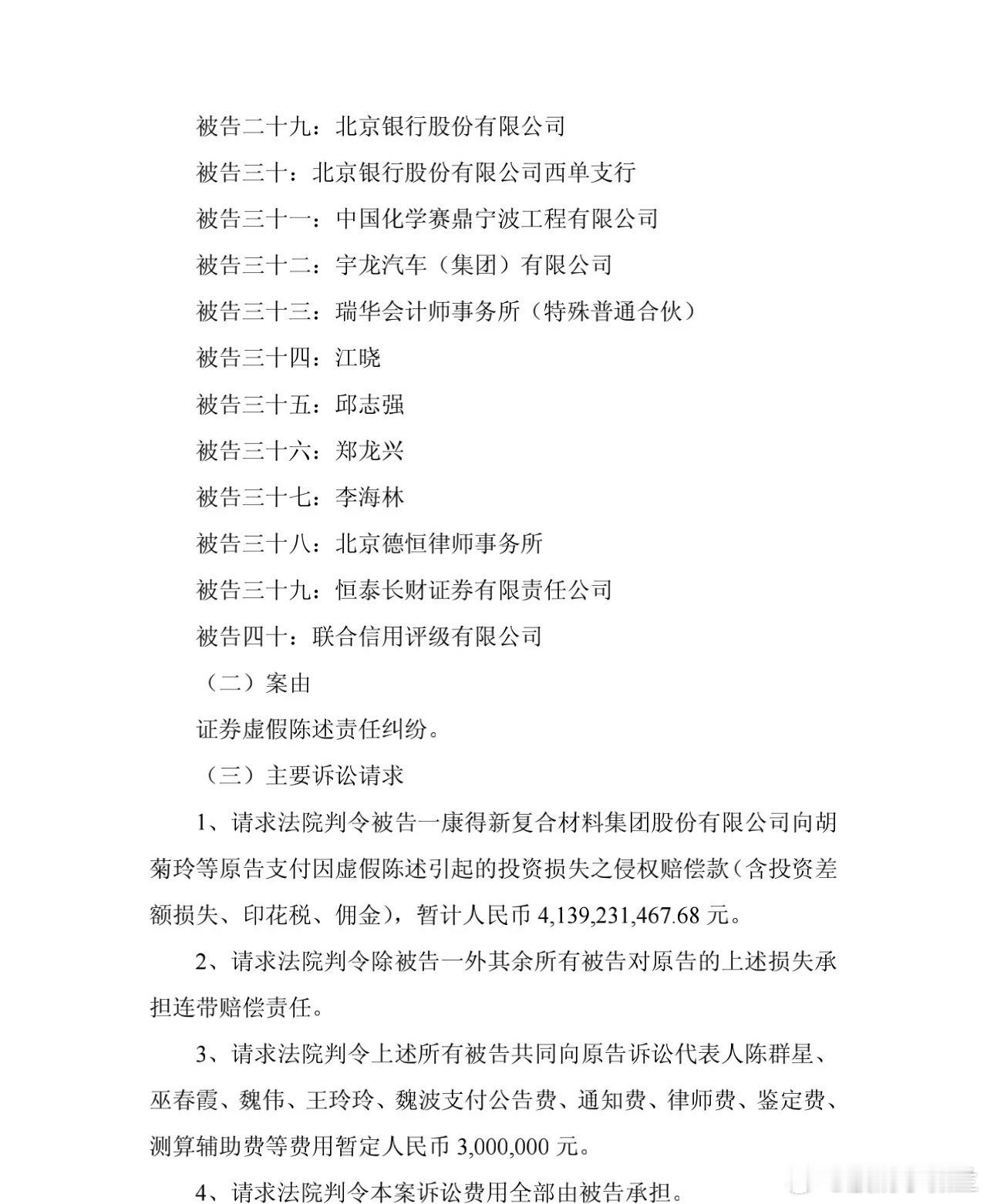 北京银行股民别慌!北京银行被康得新股民索赔41.39亿元,对北京银行影响大吗?北京银行披露的《收到应诉通知书公告》披露,康得新投资者胡菊玲等股民以证券虚假陈述事由,起诉康得新,钟玉,北京银行等40名被告,索赔合计41.39亿元。这个事情对北京银行的影响比较小。首先,41.39亿元的索赔额,只是原告的主张,法院最终核定损失数额肯定要小于这个数额。判决赔偿额通常只有核定损失额的30%左右,并不是原告要求赔多少,被告就要赔多少。北京银行在这个案件里面可能会承担连带赔偿责任,最终赔偿额,是按照责任划分的。虽然41.39亿元的数字看着吓人,但是,最终判决康得新,钟玉,会计事务所,证券公司等被告肯定要承担绝大部分赔偿,北京银行承担的赔偿比例会比较小。这个案件,股民应该是在2021年就开始起诉了,已经拖了四年,估计还得拖很久。话说,股民索赔康得新这个案件,怎么会有40名被告?股民都知道这40名被告吗?知道这40名被告都是干什么的吗?这40名被告都是股民自己找的吗?还要追加多少被告?还要提多少异议?还要拖延几年?我坚决支持股民依法起诉违法违规的上市公司,也坚定支持建立法治的证券市场,严厉谴责利用程序,规则,给股民起诉索赔设置障碍,增加起诉难度,迫使股民放弃索赔的行为。