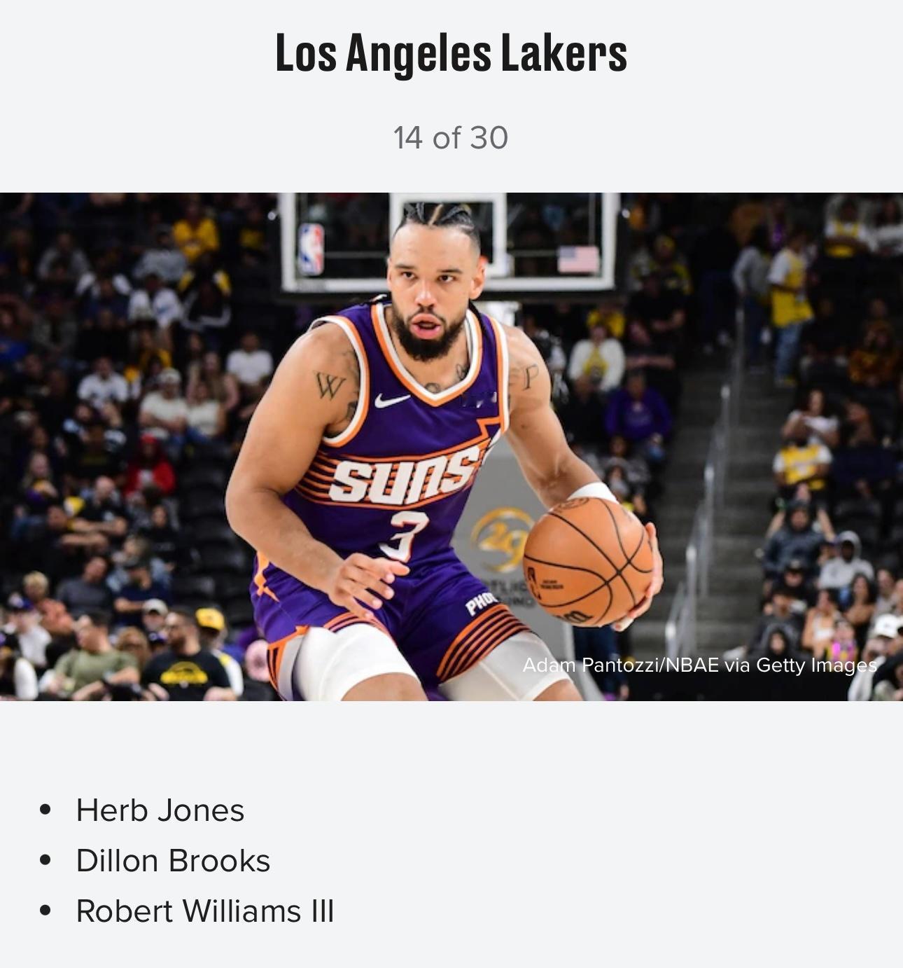 《露天看台》为联盟各队列举三大交易目标,湖人的是鹈鹕侧翼赫伯·琼斯,太阳前锋狄龙·布鲁克斯,开拓者中锋罗伯特·威廉姆斯三世。