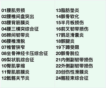腰痛 之前拍摄【100个损伤康复说明书】,列举了一系列的膝盖和腰椎损伤,你们来看看,有没有你们想了解但被漏掉的?01腰肌劳损02腰椎间盘突出03腰背筋膜炎04腰三横突综合征05棘间韧带炎06腰椎滑脱07椎管狭窄08坐骨神经卡压综合征09梨状肌综合征10臀肌挛缩11臀肌筋膜炎12骶髂关节炎13脂肪垫炎14髌骨软化15半月板损伤16前叉韧带损伤17鹅足滑囊炎18髌腱炎19下蹲受限20髌骨脱位21内侧副韧带损伤22外侧副韧带损伤23创伤性滑膜炎24髂胫束综合征 膝关节损伤 运动康复