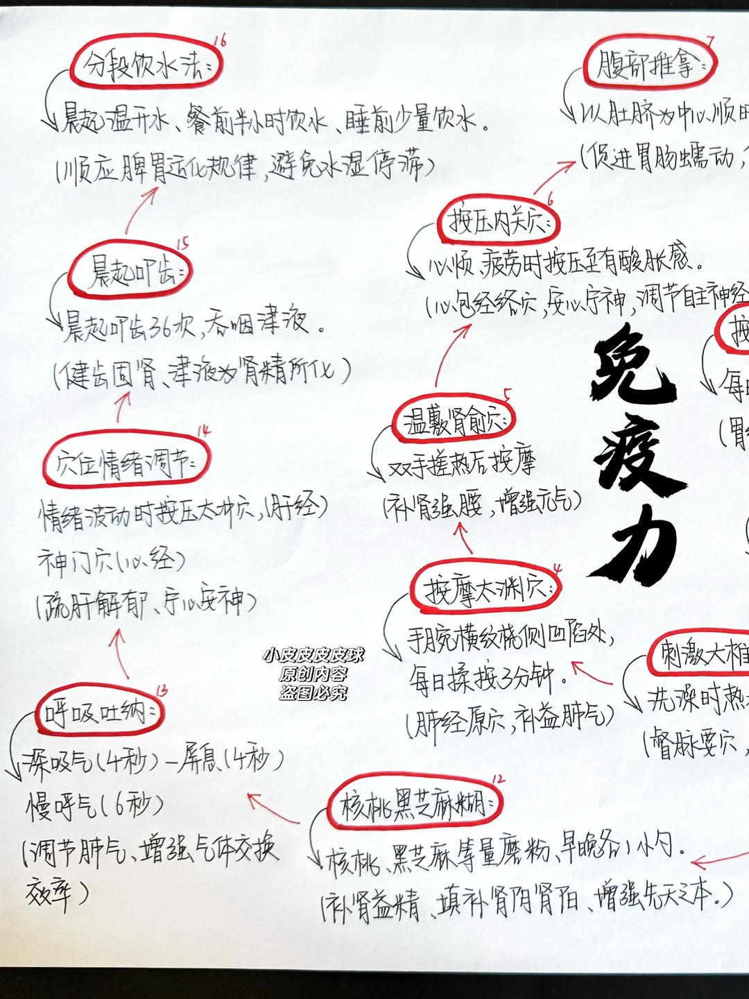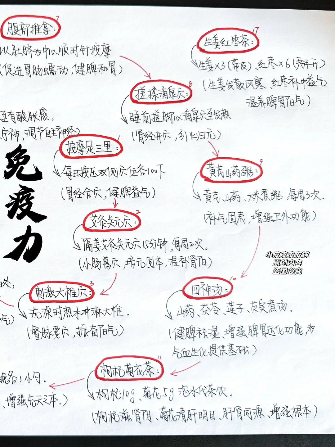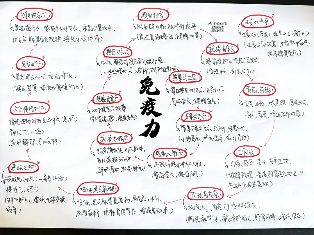 在中医看来,免疫力是我们身体自带的“正气”——就像守护健康的“门卫”,正气足了,风寒湿邪、病毒细菌都近不了身;正气弱了,才会反复感冒、换季过敏、熬夜就垮。 其实养正气一点不复杂,不用跟风买贵价补品,跟着老祖宗的方法调作息、顺饮食、养情绪,身体自然会越来越结实~ 🌿 先搞懂:中医3个“免疫开关” 1. 脾胃是“正气之源”: 脾胃运化好,吃进去的食物才能变成滋养身体的“气血”,免疫力才有燃料;脾胃虚了,补再多都没用,反而加重负担。 2. 肺气是“免疫屏障”: 中医说“肺主皮毛”,肺气足的人,皮肤和呼吸道黏膜的抵抗力强,不容易被病毒侵袭,换季也少感冒咳嗽。 3. 肾气是“免疫根基”: 肾藏精,是正气的“老本”,熬夜、过度劳累最伤肾,这也是很多人越熬越虚、免疫力直线下降的关键。 💡 中医小提醒:养正气不是“猛补”,而是“细调” • 体质偏寒(怕冷、手脚凉):多喝生姜红枣茶,少吃西瓜、冰淇淋; • 体质偏热(容易上火、口干):适量喝金银花茶、吃梨,少熬夜、少碰辛辣; • 湿气重(身体困重、大便黏腻):多吃薏米、冬瓜,少喝冷饮、少吃甜腻食物。 其实免疫力的核心,就是让身体的气血顺畅、脏腑协调,跟着这些中医方法坚持1-2个月,你会发现换季不感冒了、熬夜后也能快速恢复,整个人的气色都不一样~今天汇总了17种提高免疫力的实用方法,快来一起看看吧!