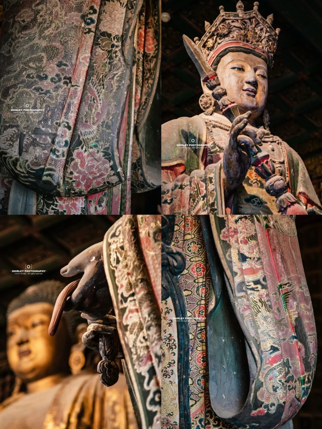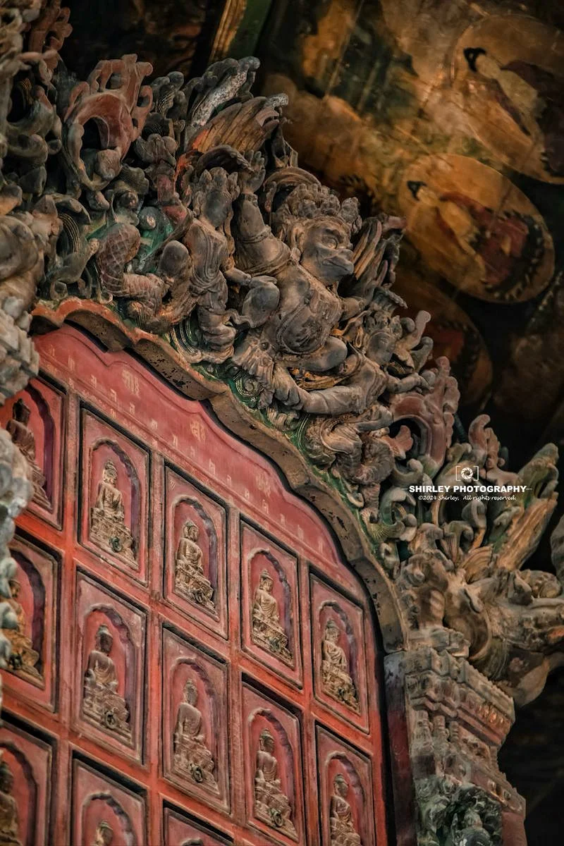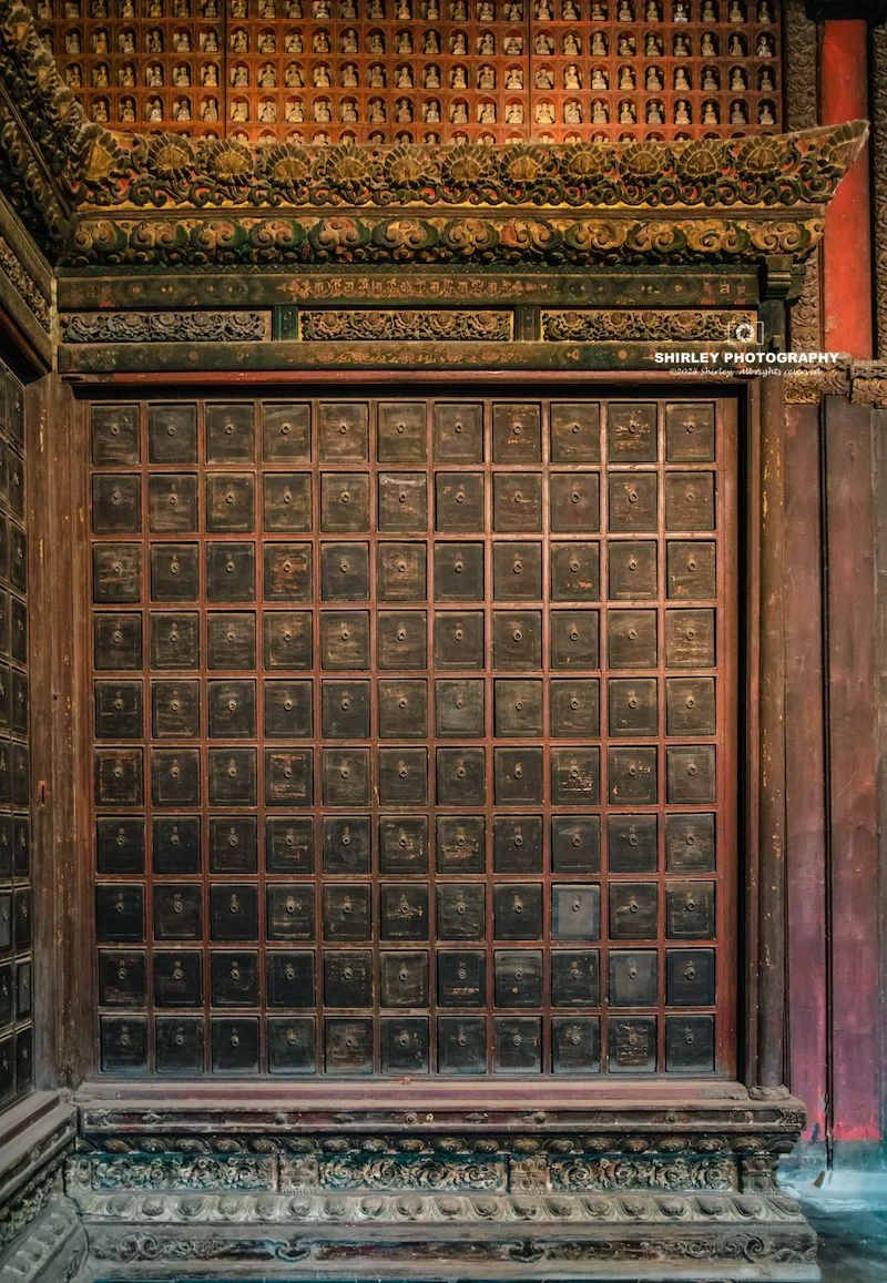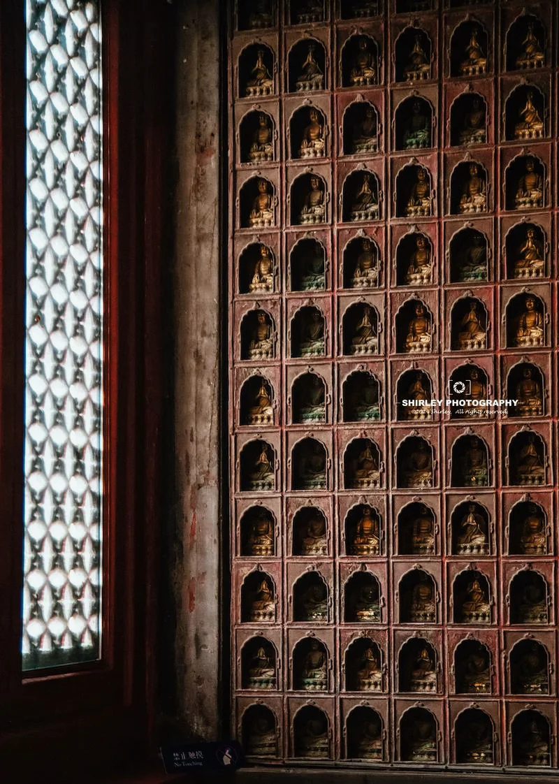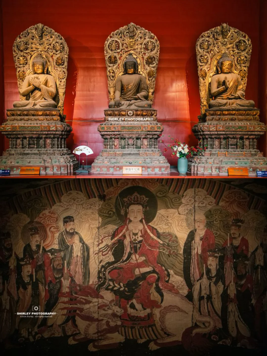 殿内漆金佛龛共9000余个,密密麻麻;正中供奉着三尊明代木质漆金彩塑气势恢宏,衣纹华丽繁复,细节精美到令人屏息伫立。