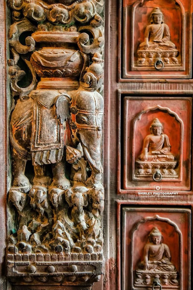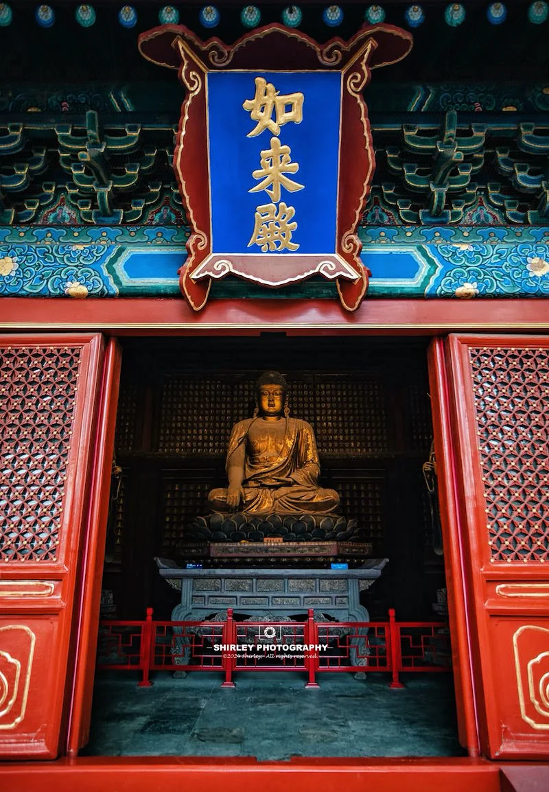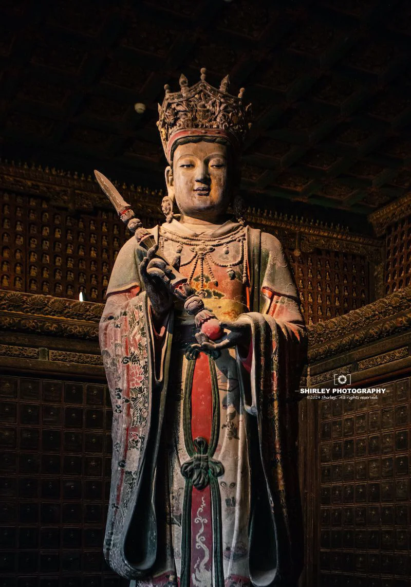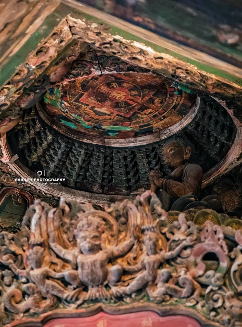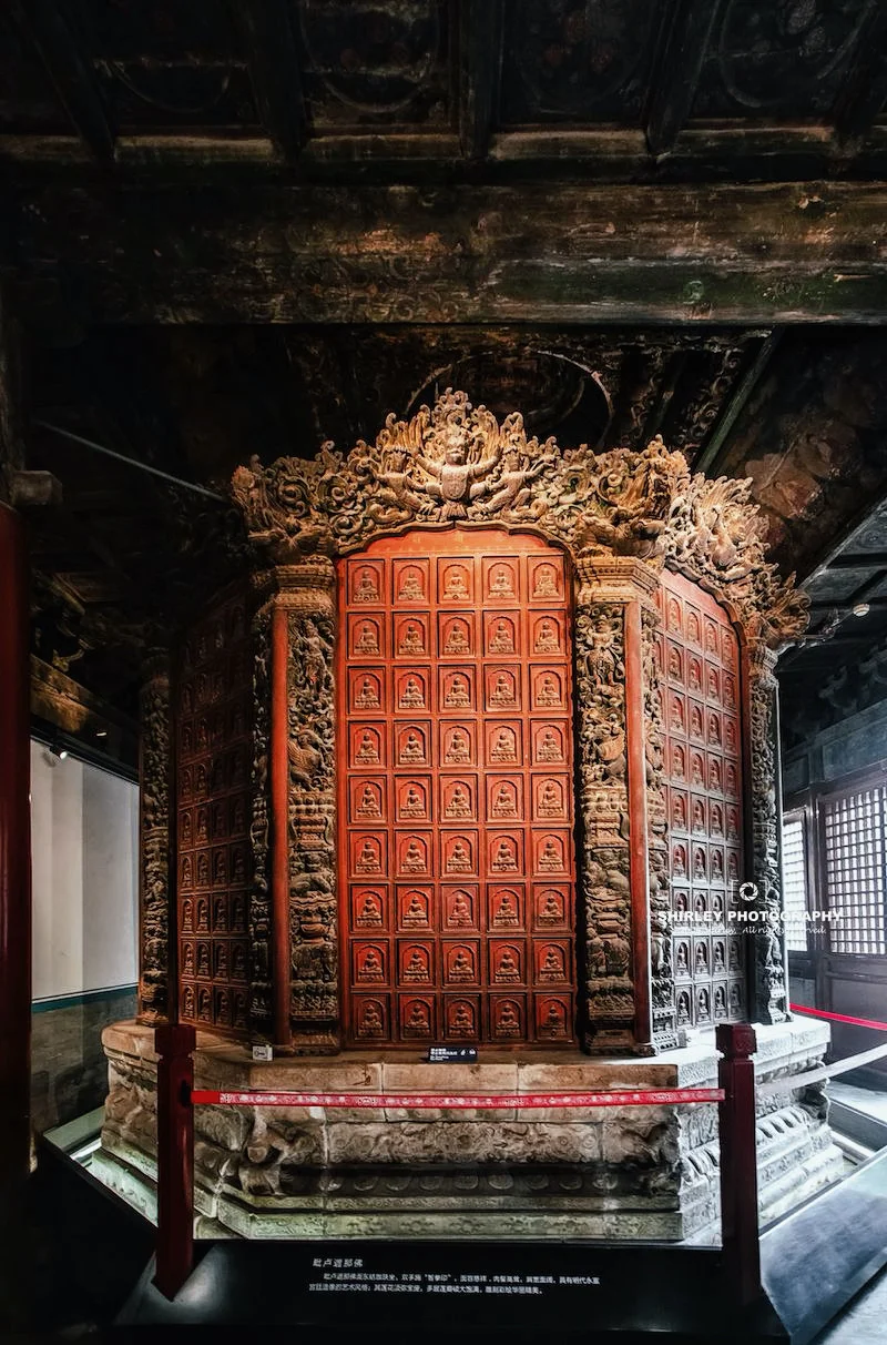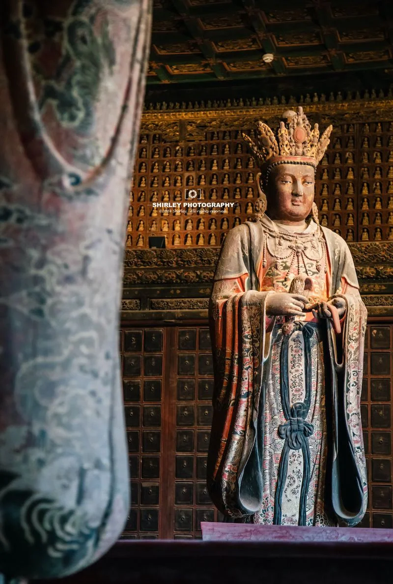 殿内漆金佛龛共9000余个,密密麻麻;正中供奉着三尊明代木质漆金彩塑气势恢宏,衣纹华丽繁复,细节精美到令人屏息伫立。