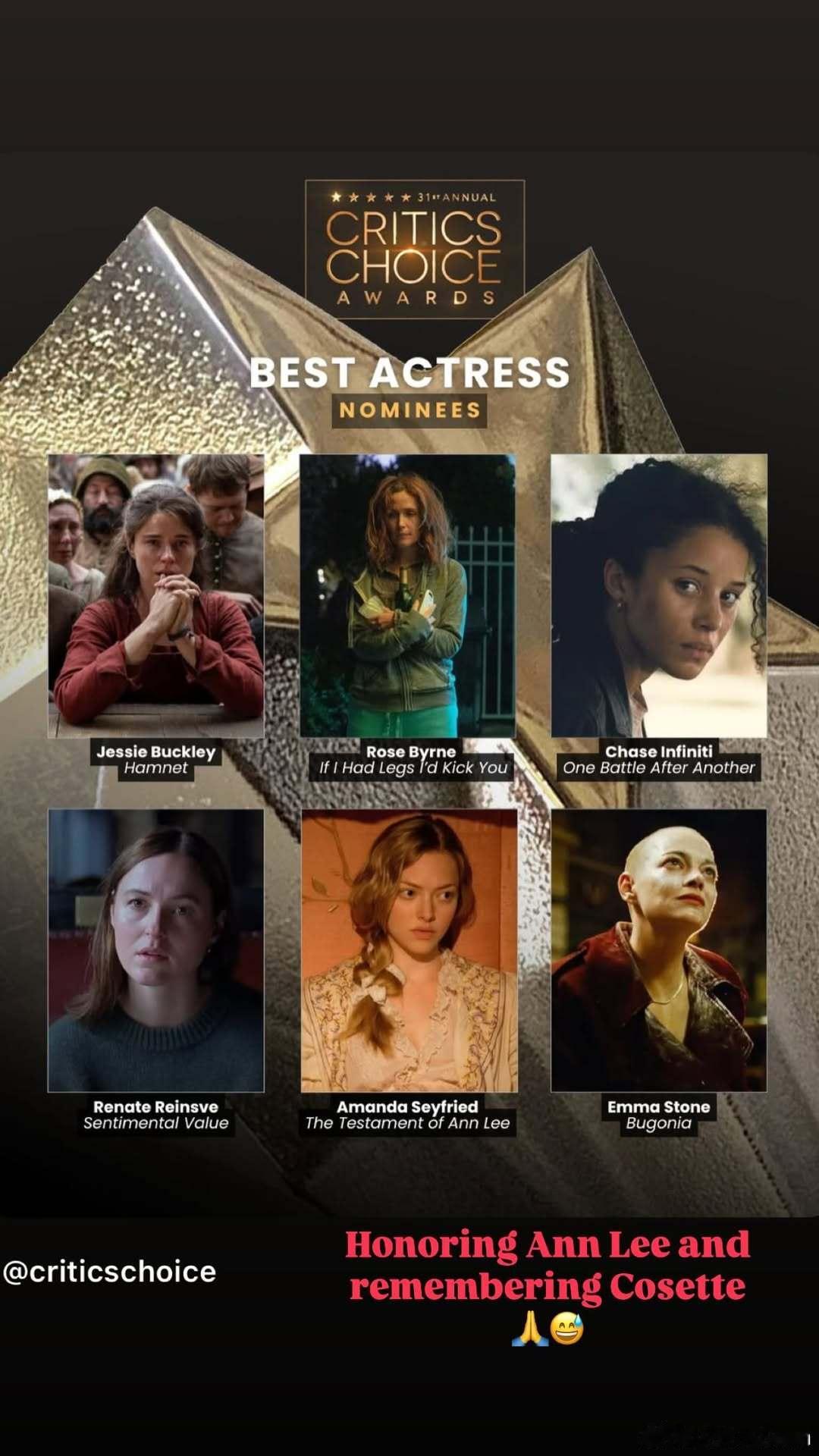 amanda seyfried阿曼达塞弗莱德凭借新片《the testament of Ann Lee》获得评论家选择奖最佳女主的提名,但官方提名单用的是《悲惨世界》的剧照,阿曼达评:不忘珂赛特