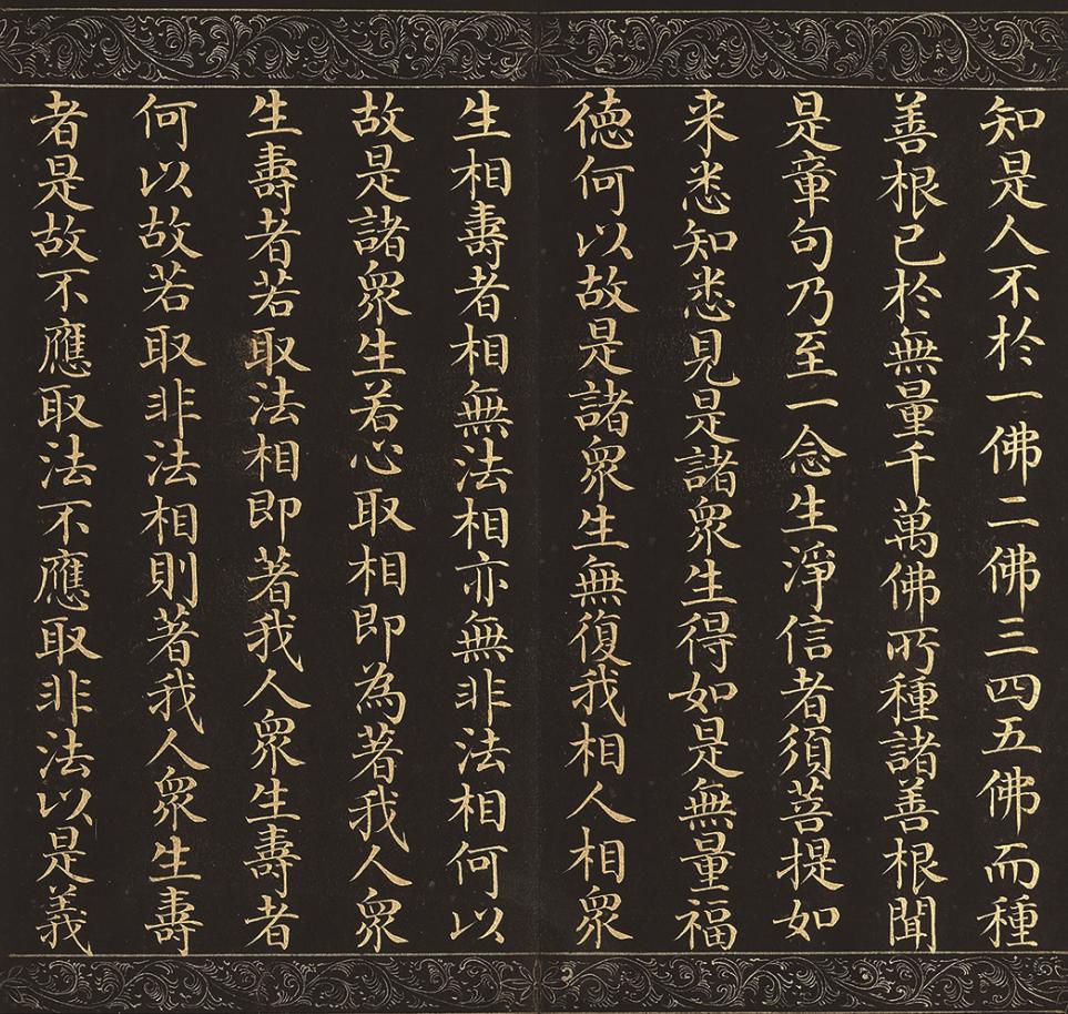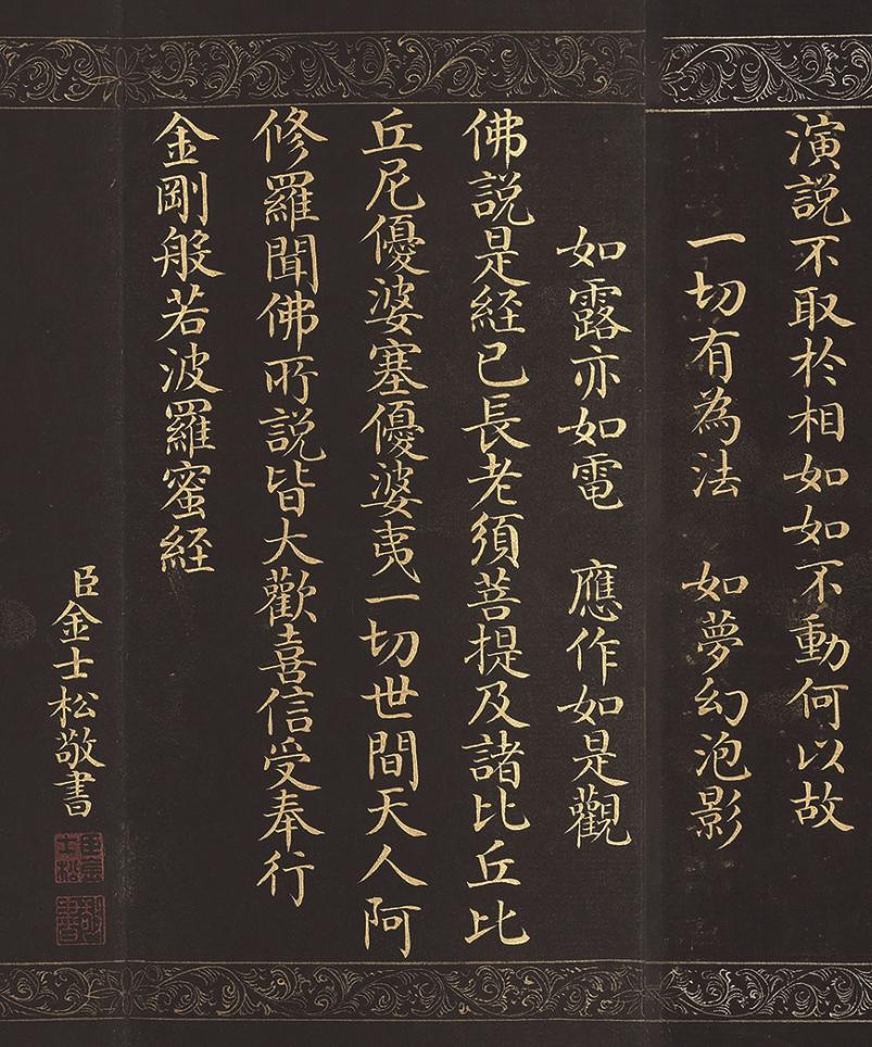 这是翰林院才子抄写的《金刚经》,乾隆将它放在案头,当代九成书家无此功力! 我们常说古代随便一个读书人的字,都能“吊打”当代一半的大师专家,就更不用说那些进士及第、入翰林院的大才子了。乾隆朝有一位进士,在科举之前就以书法闻名于世,金榜题名后乾隆特地请他为自己抄写《金刚经》,写好后放于案头朝夕欣赏,此人就是金士松。 金士松是乾隆二十五年(1760年)的进士,被授编修,迁侍读,直懋勤殿写经。凭借这一手“绝活”,他平步青云,累迁礼部尚书,嘉庆帝的小楷就是跟金士松学的,所以他也可以说是“帝师”了。 这部小楷《金刚经》现藏于台北故宫,为纸本册页,共21折、42页,每页纵约32厘米、横约29.5厘米,总长度超过12.4米,单字大小约1.5厘米。由于是奉敕所写,不仅倾尽功力,还使用了上好的瓷青笺纸和金粉墨,高贵典雅。 他取法颜真卿的沉实与柳公权的劲健,起笔多藏锋重按,逆锋入纸后铺毫而行,墨色凝实如铁铸。提按顿挫精准有度,竖画中段略细却力劲不塌。转折处多“方中带圆”,转角笔锋顿驻即转,避免硬折的生硬,尽显“绵里裹铁”的质感。 与一般馆阁体的刻板不同,他的撇捺笔画末端稍带灵动,捺画往往轻提收笔,为规整笔法注入生气。结字平稳端庄,疏密得宜,契合佛经卷的肃穆庄严。 字形偏方正,左右匀称,横画平正如砥,竖画挺拔似松。偏旁搭配暗藏巧思,左右结构的字左部紧凑收束,右部舒展开阔,形成密疏对比。 全篇字字大小匀净,却在细节处藏变化,撇画稍短显稳重,撇画略长增舒展,金书匀净温润,笔画间墨色衔接自然,尽显书写功力。 这种墨色变化虽不张扬,却暗合经文的节奏韵律。清代《国朝书人辑略》称其“楷书精绝,馆阁体中独得雅韵”; 当代书法学者刘恒指出“金士松的楷书,是馆阁体‘规范性’与‘艺术性’平衡的典范”,将其与成亲王永瑆楷书并列为“清代馆阁体双璧”。 这幅作品的珍贵,不只在技法的精熟,更在证明馆阁体亦可“工中见雅”——以扎实功底为基,以文人修养为魂,便能在规范中写出独特风骨,为后世学楷者提供“守正出新”的绝佳参照。 我们在写小楷时,往往一味求精致、工整,结果出现板滞气息,久而久之笔法单一、气韵僵死,而金士松的小楷书稳健而不失韵味,工整又不缺生动,是我们学习正宗楷法又纠正弊病的绝佳范本。 而今,我们将此作进行了博物馆级的超高清1:1复制,并添加释文一一对应,便于您临摹和欣赏。 金士松小楷金册 高清原大微喷复刻手工经折装印刷书法