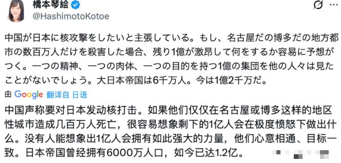 日本“右翼”再次表态:1亿日本人会跟中国拼命,这次表态的人还真不一般,她是日本“右翼”的核心人物之一。 首先我们要清楚,日本“右翼”怎么突然整出了这样的口号,原因很简单,那就是日本怕咱们对他们使用“核武器”。 日本确实有害怕的理由,毕竟日本也算的上是“有核”国家,只不过是当初日本给他的时候,他没有接住罢了。 所以说如果问世界上那个国家最清楚“核武”的力量,日本大概率是最有发言权的,所以日本“右翼”用这种方式告诉咱们,如果咱们使用“核武”,那日本绝不会善罢甘休。 要知道,如果中日战争真的爆发,咱们会不会使用“核武”咱们不清楚,但日本大概率是不会守规矩的,毕竟日本什么德行大家应该都清楚,所以如果日本执迷不悟,咱们不用“核武”,也能痛击日本。 那么,这股极端的情绪究竟是从何而来?很多人第一反应可能是觉得日本又在故技重施,搞军国主义的那一套。但如果我们往深了挖一层,会发现这背后其实潜藏着一种深刻的、几乎是写在民族记忆里的恐惧——对核武器的恐惧。 这事儿还得从几十年前说起,日本是世界上唯一一个亲身品尝过核弹滋味的国家,那种从天而降、瞬间将一座城市化为焦土的恐怖,早已刻进了他们的骨髓里。 所以,当中国的综合国力,尤其是军事实力飞速发展,核威慑能力日益增强时,这种深藏的恐惧就很容易被一些别有用心的人给挑动起来。 他们抛出“一亿玉碎”的口号,听起来是悍不畏死,但换个角度想,这恰恰是一种极度不安全感的体现。 这个口号本身就带着浓厚的历史色彩,它源自二战末期,当时日本军国主义政府为了做最后的挣扎,号召全体国民,无论男女老少,都要用竹刀、锄头去对抗盟军的登陆,企图用一亿人的生命来换取所谓的“尊严”。 如今,这个沉寂了多年的口号被重新搬上台面,其背后的信号值得我们警惕。这不仅仅是对外的叫嚣,更是对内的一种动员,试图将整个国家拖入一种非理性的、极端对立的氛围里。 有意思的是,日本自己其实是个“准核”国家。这话怎么说呢?虽然他们口头上坚持“无核三原则”,但谁都知道,日本拥有顶尖的民用核技术和庞大的核材料储备,理论上,只要他们愿意,在很短的时间内就能造出核武器。 他们之所以没有跨出那一步,一方面是受制于战后体制和国际社会的监督,另一方面也是因为有美国的“核保护伞”罩着。这种又怕又想要的心态,让日本在核问题上的姿态显得格外扭曲和复杂。 他们既害怕别人用核武器对付自己,又暗暗地保留着随时可以拥核的选项,这种矛盾心理,也让他们在面对核大国时,容易产生过激的反应。 再看看日本近些年的动作,你会发现他们的“不守规矩”已经不是什么新鲜事了。从修改和平宪法,到大力发展进攻性武器,再到公开讨论要拥有“对敌基地攻击能力”,也就是我们常说的“先发制人”打击权。 这一步步的操作,早已突破了战后日本作为“专守防卫”国家的底线。他们所谓的“规矩”,似乎只在对自身有利的时候才存在。如果中日之间真的发生冲突,谁也无法保证日本会严格按照战争的法则来行事,他们的历史记录,实在让人难以放心。 所以,面对这种“一亿人拼命”的叫嚣,我们倒也不必太过当真,更不能被其带偏节奏。现代战争的胜负,早就不单单取决于一腔热血和喊口号的音量了。 它是一场综合国力的全面较量,涵盖了经济、科技、信息、能源等方方面面。在这些领域,我们的优势是显而易见的。真正的较量,是在这些看不见硝烟的战场上。 至于核武器,那更是悬在所有人头上的达摩克利斯之剑,是最后的、也是谁都不愿触碰的选项。 日本右翼政客的这番话,究竟是为了转移国内矛盾的政治表演,还是真的在为某种危险的战略铺路?这背后的真实意图,恐怕比口号本身更值得我们深思。对此,你怎么看?