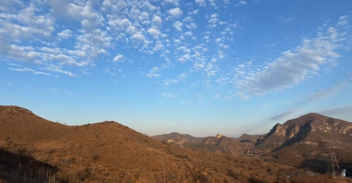 这波山景+天空直接美到我失语! 蓝天跟开了滤镜似的透,云是碎碎的“棉花糖碎”,软fufu飘着。下边的山虽说裹了层焦糖色枯草,可那起伏的轮廓特飒,右边那座带岩石的,硬气得像天然雕塑~远处电线杆子还凑了个热闹,野趣里掺点人间烟火,味儿对了! 坐这儿晒会儿太阳,风裹着土腥味往脸上扑,一周的累直接蒸发。
