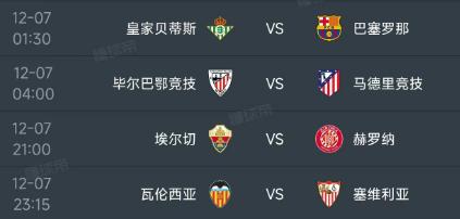 北京时间12月7日,明天的西甲联赛第15轮赛程如下: 第一场01:30,皇家贝蒂斯PK巴萨:巴萨上一场3-1逆转马竞迎来5连胜,目前领先皇马1分暂列第一,对于巴萨来说竞争冠军的对手就是皇马,他们做好自己巩固榜首。皇家贝蒂斯目前以24分暂列第5名。 第二场04:00,毕尔巴鄂竞技PK马竞:马竞上一场1-3不敌巴萨,遭遇赛季第二败,明天的客场之行立足防守,避免连败 第三场21:00,埃尔切PK赫罗纳:赫罗纳目前排在倒数第三,他们要为了保级而战 第四场23:15,瓦伦西亚PK塞维利亚:瓦伦西亚目前的积分是14分,塞维利亚以16分暂列第13名。