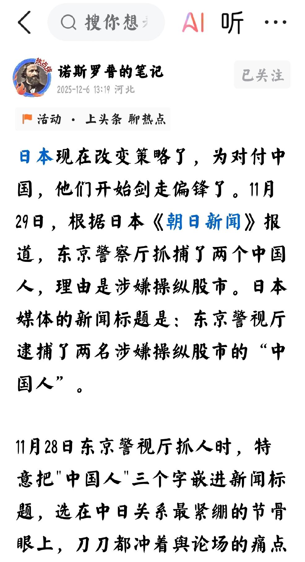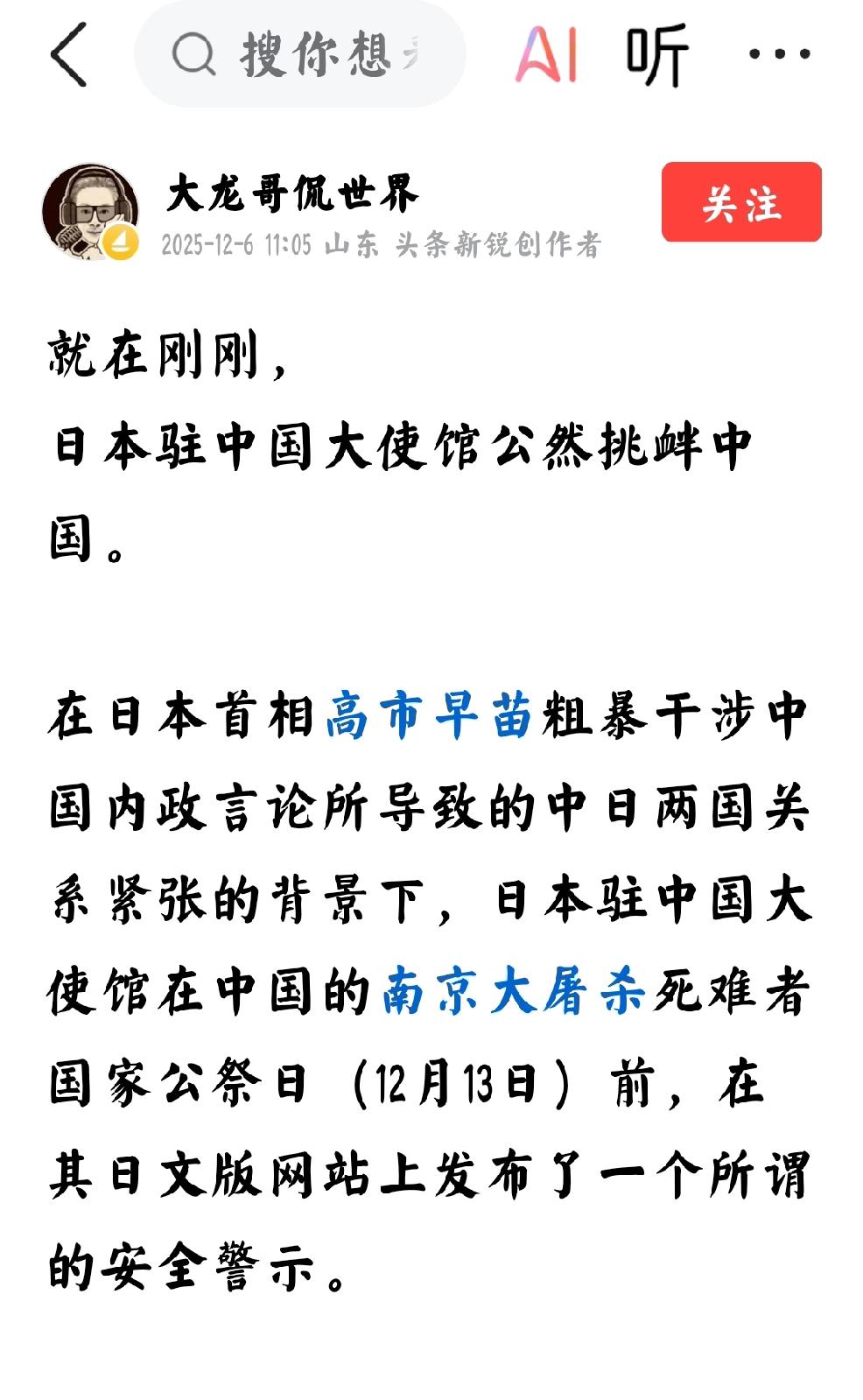 不想日本的反制如此幼稚,但需要重视 个人认为:虽然12月6日日本的反应如此可笑,但也要重视。因为这是顽抗到底的标志,这是死不悔改的标志,这也是新日本法西斯,死灰复燃的标志。 看这两个可笑又非常阴险的日本反应: 大使馆在日文界面发布安全提醒,刻意的把南京大屠杀改为南京事件,并且恶意构陷,恶意引导。 日本警察把一件普通的刑事案件 — 股票操纵案,政治化处理,污水泼向了中国,传播中国威胁论。 个人觉得可笑,但是正是因为这种可笑才验证了日本普通民众愿意相信这种可笑简陋的谎言化叙事。 现在不再是简单的说错话的问题,而是日本是中国实现真正统一的绊脚石,是日本不承认1945年无条件投降的事实,是日本不承认联合国宪章的事实。
