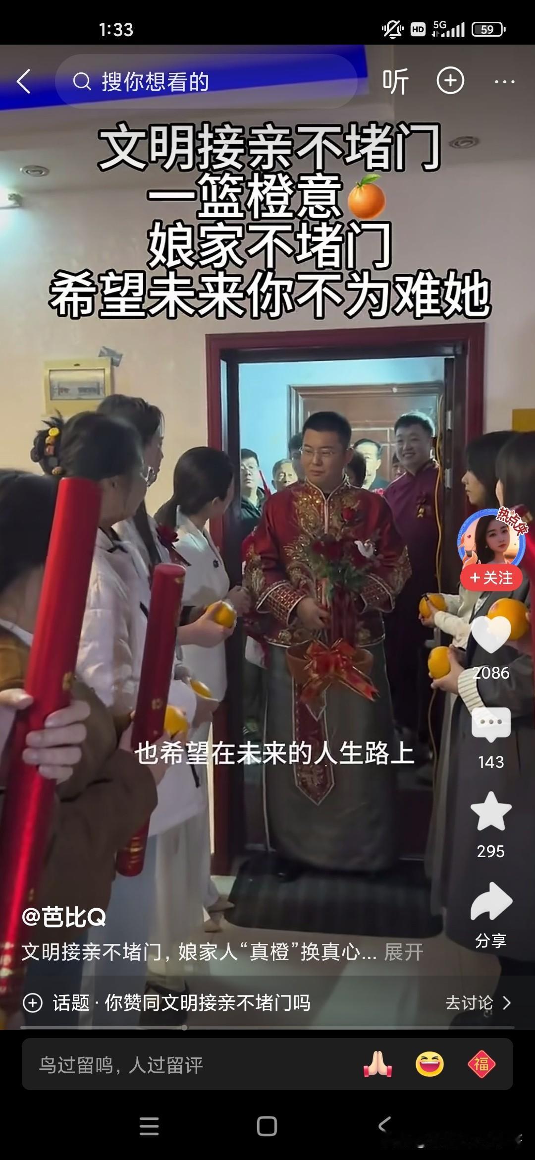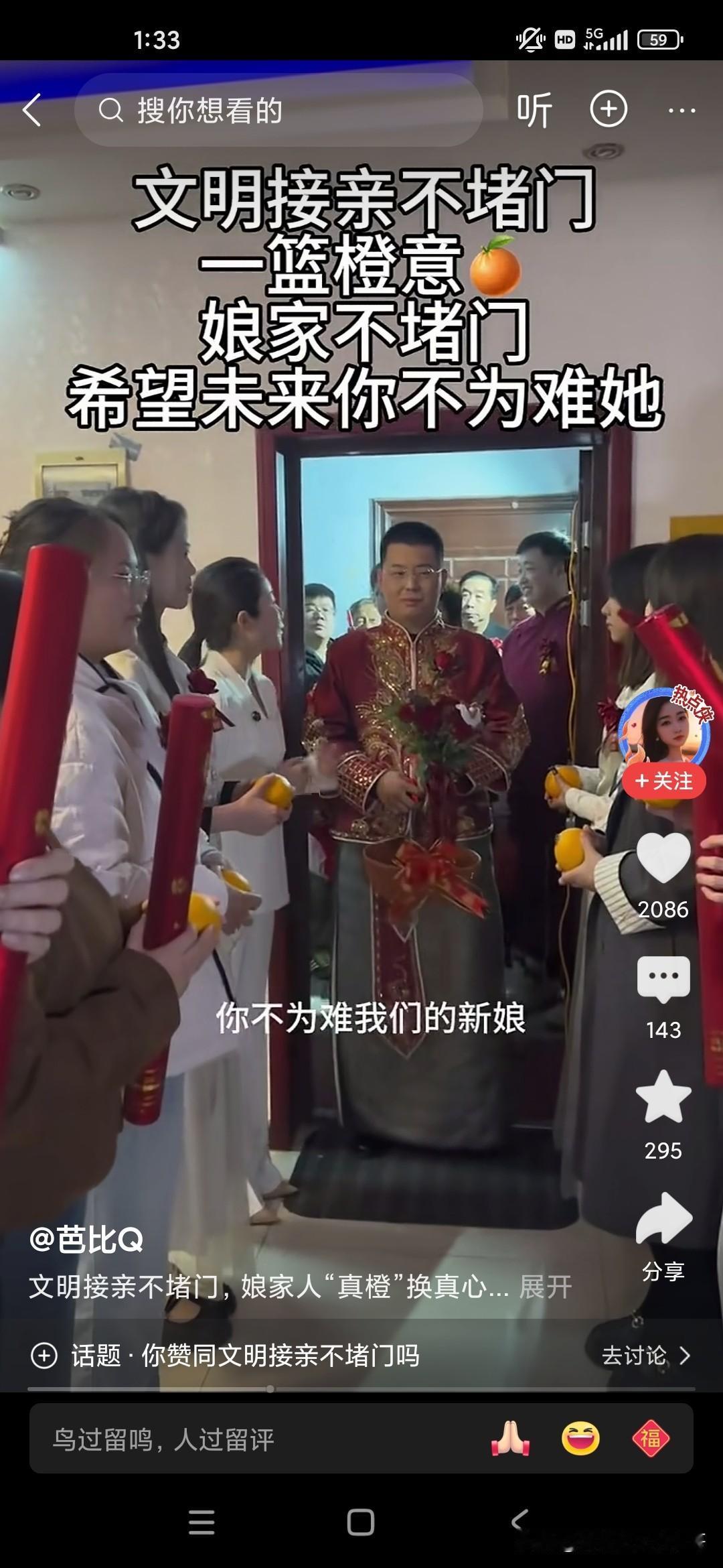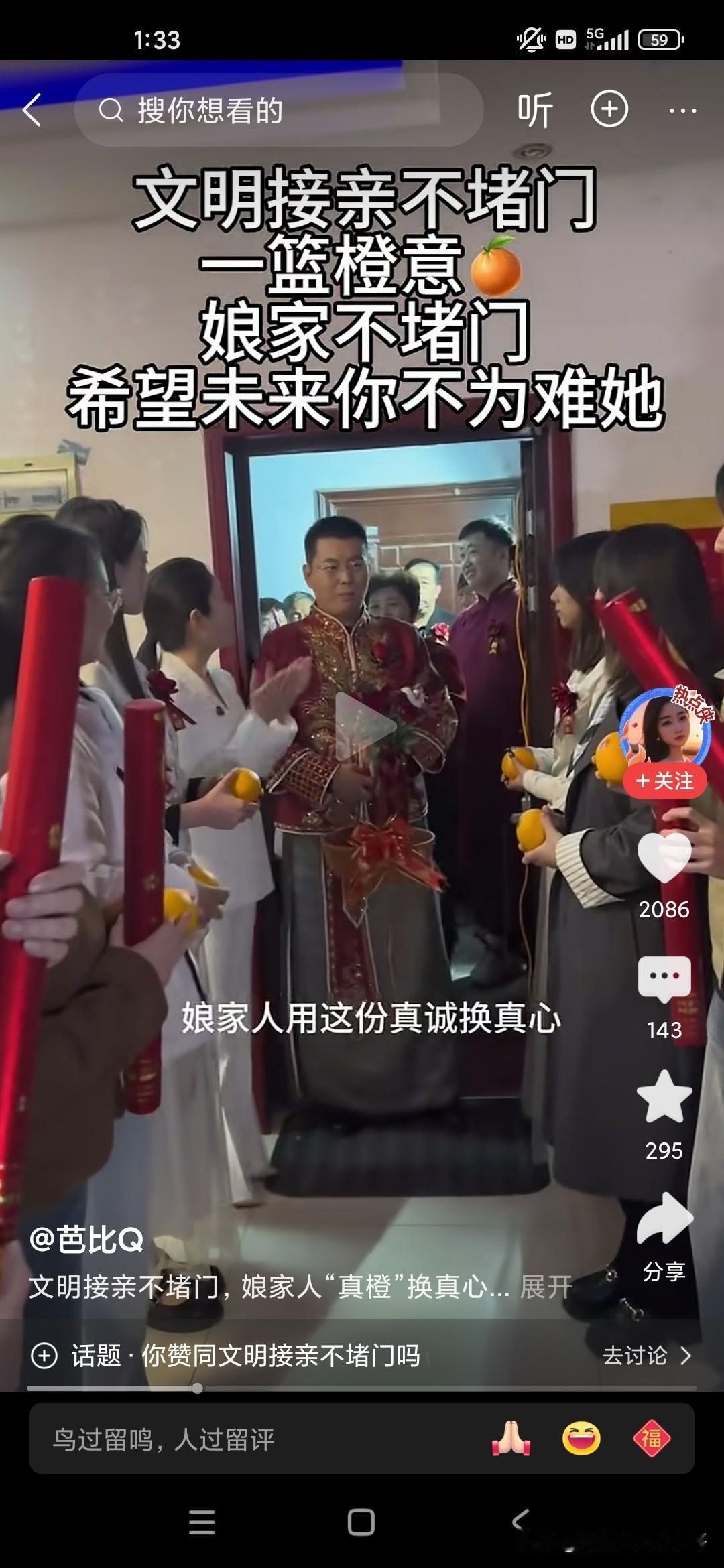 在很多地方都有新娘锁门为难新郎这个环节,其实这个环节的寓意就是让新郎知道新娘没有那么容易被追上,然而这一家就跟世俗的堵门完全不一样,每个人手中都拿一个橙子,而且大门完全敞开,也不会为难伴郎和更不会为难新娘,后来新娘的亲人呐就给新郎讲,你看到我们每个人手中都拿了一个橙子,代表我祝福你们的婚姻心想事成,同时的话,你也看到了我们的新娘没有在这接亲的过程中没有为难你,也希望你们结婚之后的话,在未来的人生道路上不要为难新娘,我要为这新娘这一家点赞,他们是明大理明是非的人!