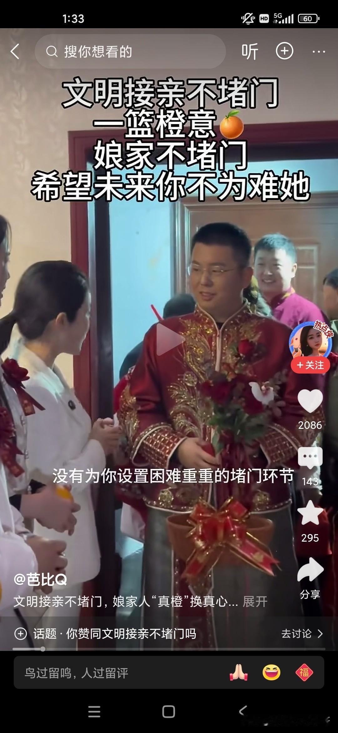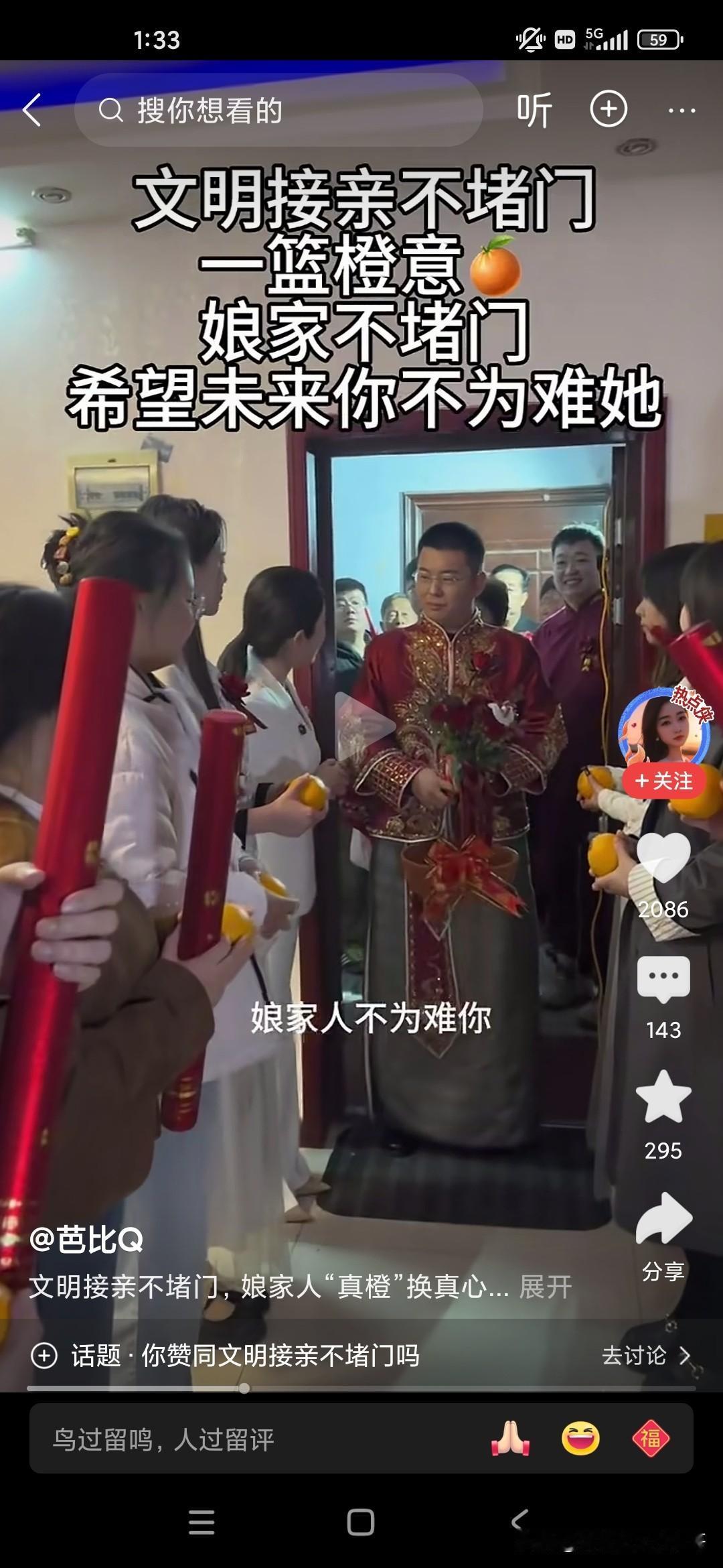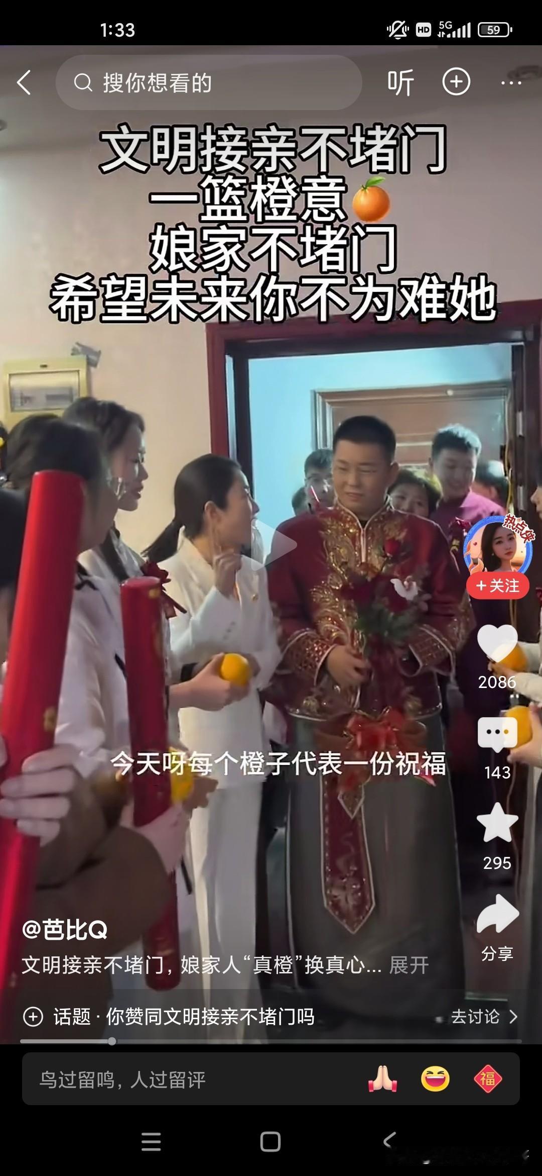 在很多地方都有新娘锁门为难新郎这个环节,其实这个环节的寓意就是让新郎知道新娘没有那么容易被追上,然而这一家就跟世俗的堵门完全不一样,每个人手中都拿一个橙子,而且大门完全敞开,也不会为难伴郎和更不会为难新娘,后来新娘的亲人呐就给新郎讲,你看到我们每个人手中都拿了一个橙子,代表我祝福你们的婚姻心想事成,同时的话,你也看到了我们的新娘没有在这接亲的过程中没有为难你,也希望你们结婚之后的话,在未来的人生道路上不要为难新娘,我要为这新娘这一家点赞,他们是明大理明是非的人!