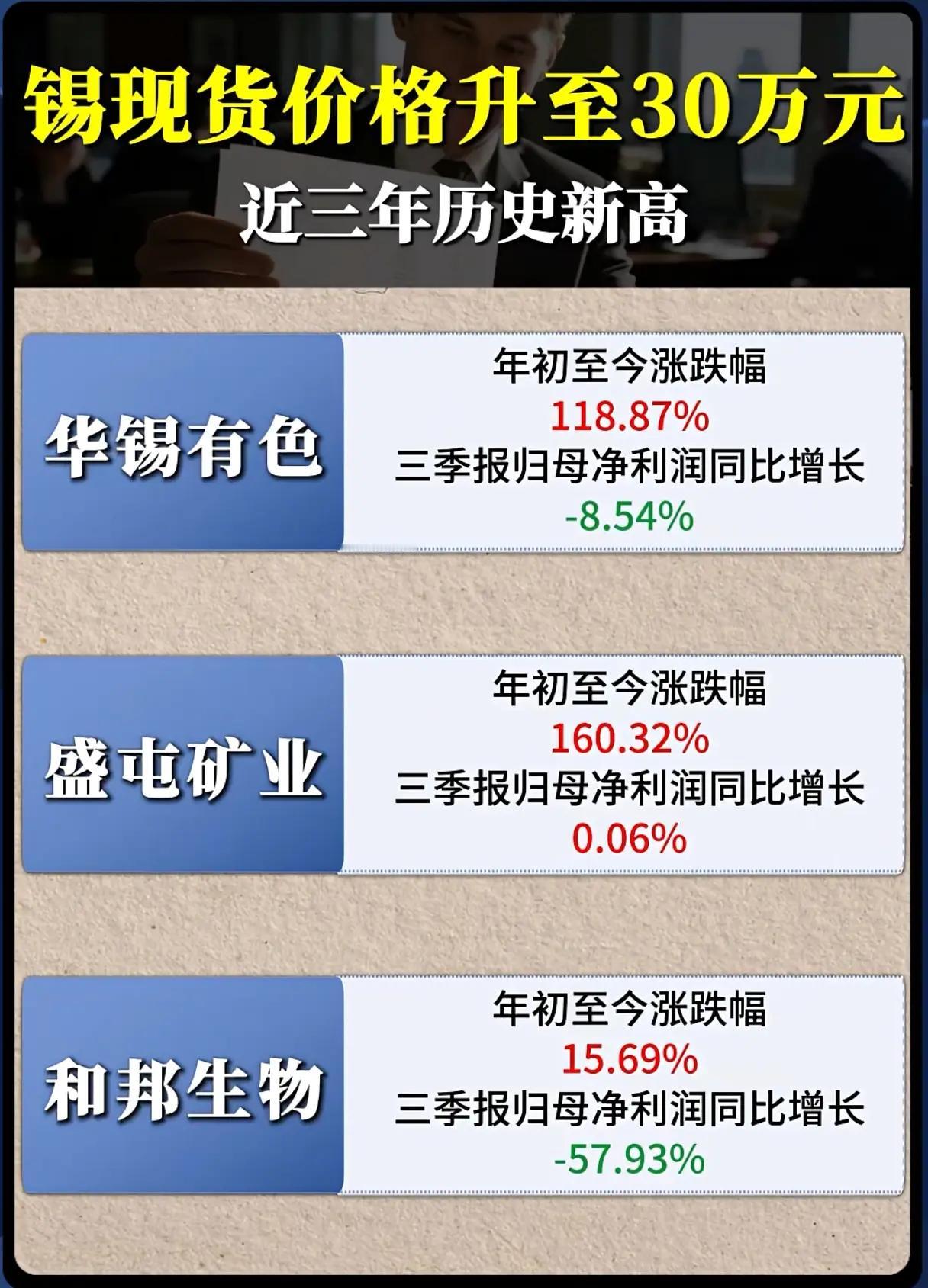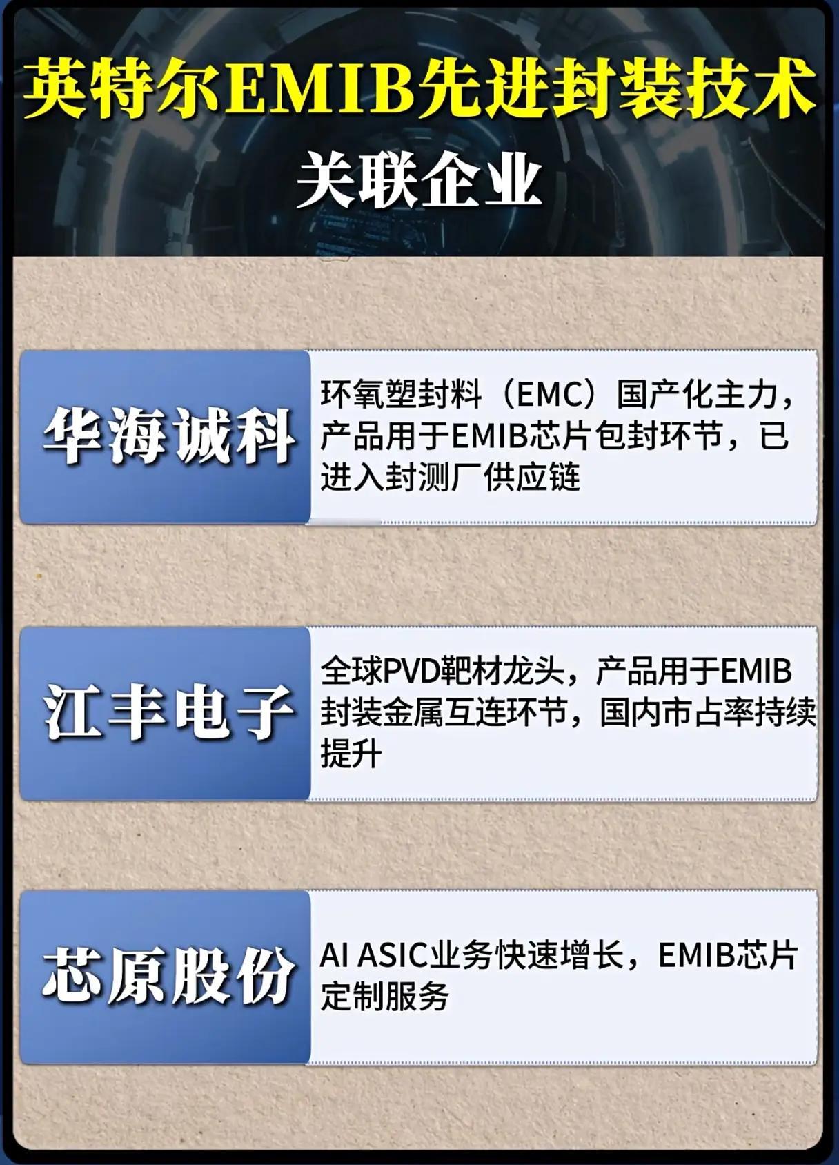 三类概念股,具体如下: 一是英特尔EMIB先进封装技术关联企业。共两张图,介绍了长电科技、通富微电、盛美上海、华海诚科、江丰电子、芯原股份等6家关联企业,涉及各企业在EMIB技术中的具体合作或服务方向,如长电科技为英特尔提供Fan-Out封装服务,华海诚科的环氧塑封料用于芯片包封环节,江丰电子的PVD靶材用于封装金属互连环节等。 二是人形机器人概念产业链细分梳理。共两张图,梳理了产业链的三大环节及对应企业:第一部分包括减速器(绿的谐波、双环传动等7家)、执行器总成(三花智控、拓普集团2家)、丝杠(秦川机床、五洲新春等10家);第二部分涵盖传感器(柯力传感、汉威科技等5家)、电机(鸣志电器、汇川技术等10家)、本体(博实股份、埃斯顿等7家),各企业按环节分类清晰呈现。 三是锡现货价格及关联上市公司表现。共两张图,聚焦锡现货价格升至30万元(近三年历史新高)的背景,介绍了华锡有色、盛屯矿业、和邦生物、紫金矿业、锡业股份、兴业银锡6家公司的市场表现与业绩:年初至今涨跌幅方面,盛屯矿业(160.32%)、兴业银锡(226.33%)、华锡有色(118.87%)等涨幅显著;三季报归母净利润同比增长方面,紫金矿业(55.45%)、锡业股份(35.99%)等实现正增长,部分公司如华锡有色(-8.54%)、和邦生物(-57.93%)则出现下滑。