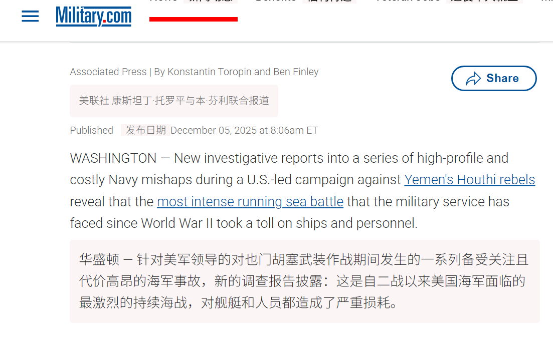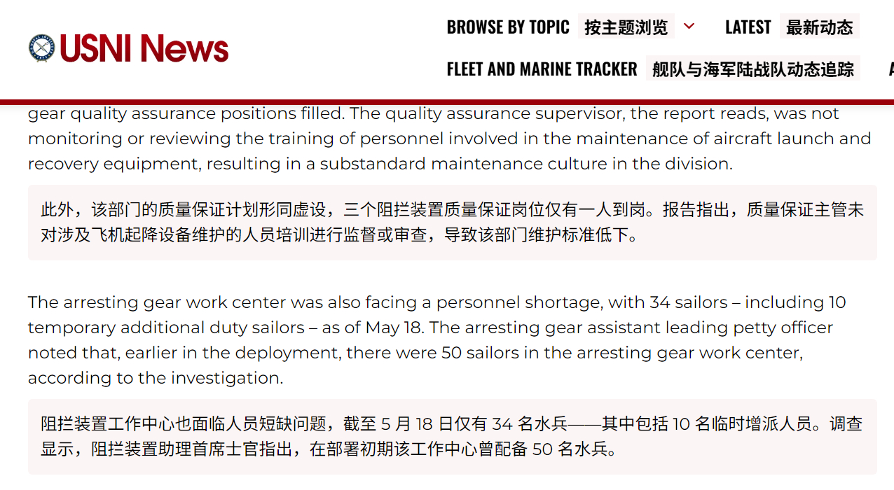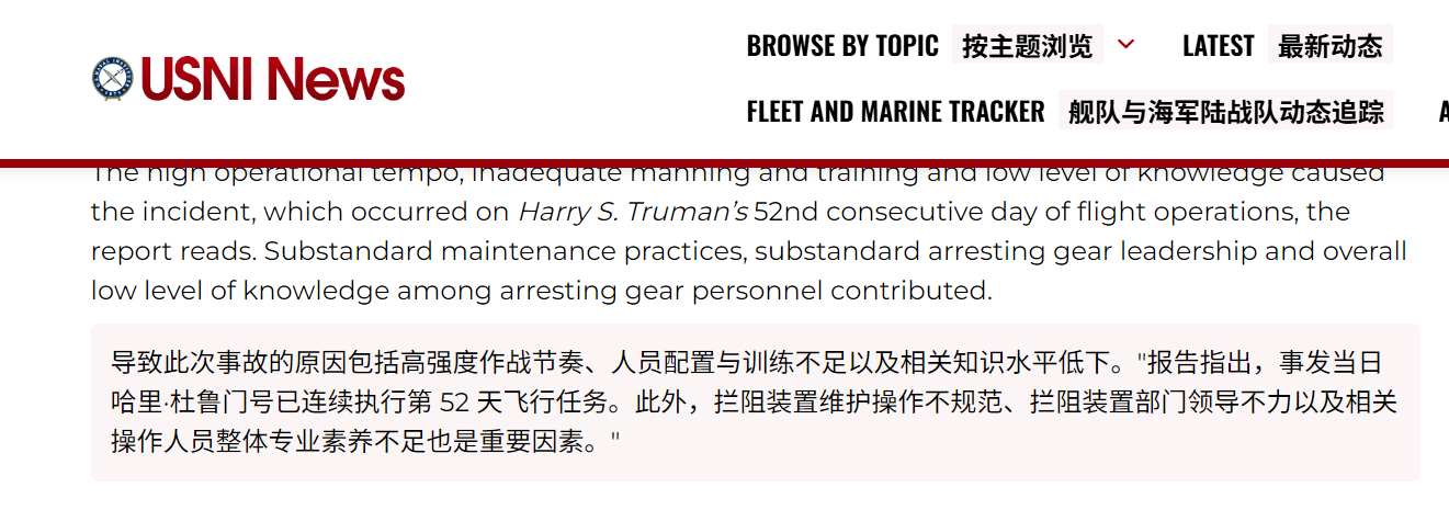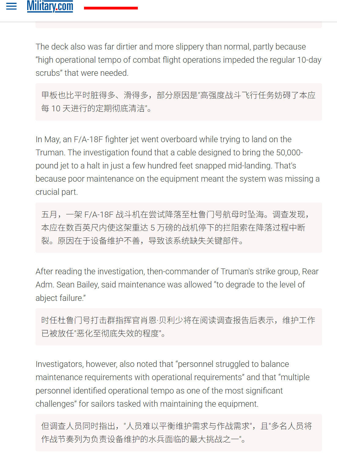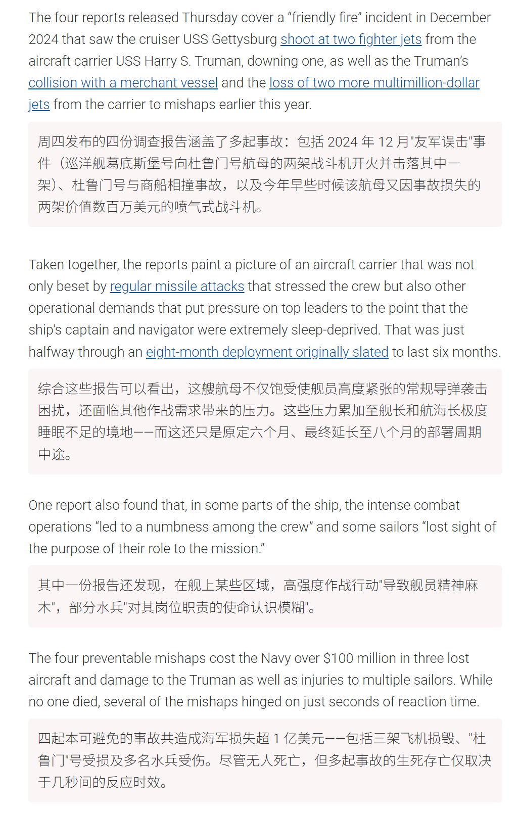 🔻美军将杜鲁门号航母连遭损失归咎于打击胡塞武装导致的“睡眠剥夺压力”——杜鲁门号航母不仅饱受使舰员高度紧张的常规导弹袭击困扰,还面临其他作战需求带来的压力。这些压力累加至舰长和航海长极度睡眠不足的境地——而这还只是原定六个月、最终延长至八个月的部署周期中途。🔻其中一份报告还发现,在舰上某些区域,高强度作战行动“导致舰员精神麻木”,部分水兵“对其岗位职责的使命认识模糊”。🔻新的调查报告披露:这是自二战以来美国海军面临的最激烈的持续海战,对舰艇和人员都造成了严重损耗。🔻甲板也比平时脏得多、滑得多,部分原因是“高强度战斗飞行任务妨碍了本应每 10 天进行的定期彻底清洁”。时任杜鲁门号打击群指挥官肖恩·贝利少将在阅读调查报告后表示,维护工作已被放任“恶化至彻底失效的程度”。🔻“美国海军尚未做好持久战准备”——调查发现。🔻不是,打胡赛都能把美海军逼成这样吗?那第三岛链你们还守不守了?美军承认击落美军战机 热点现场 海外新鲜事