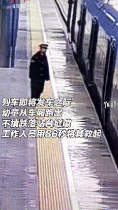 太伟大了!86秒挽回一条生命! 站台上,一列火车准备发车,车门即将关闭时,一幼童恰巧从车上跑出,掉入站台缝隙…… 站台上巡视的工作人员一转身恰好看到,就一秒钟的缘份,拯救了一个家庭! 他立刻奔了过去,并提醒其他同事通知列车不要马上启动…… 两名工作人员合力将孩子拽上站台,孩子得救了,仅仅用了86秒! 太惊险了!如果他没转身……孩子可能就没了! 真的不敢想象! 世界上没有“如果”二字! 感谢工作人员的神速反应! 终于知道站台上有人巡视的重要性了! 孩子的父母该怎样感谢救命恩人? (视频来源:中国青年报) 随手拍张照 站台救人 传播正能量 救小孩一命