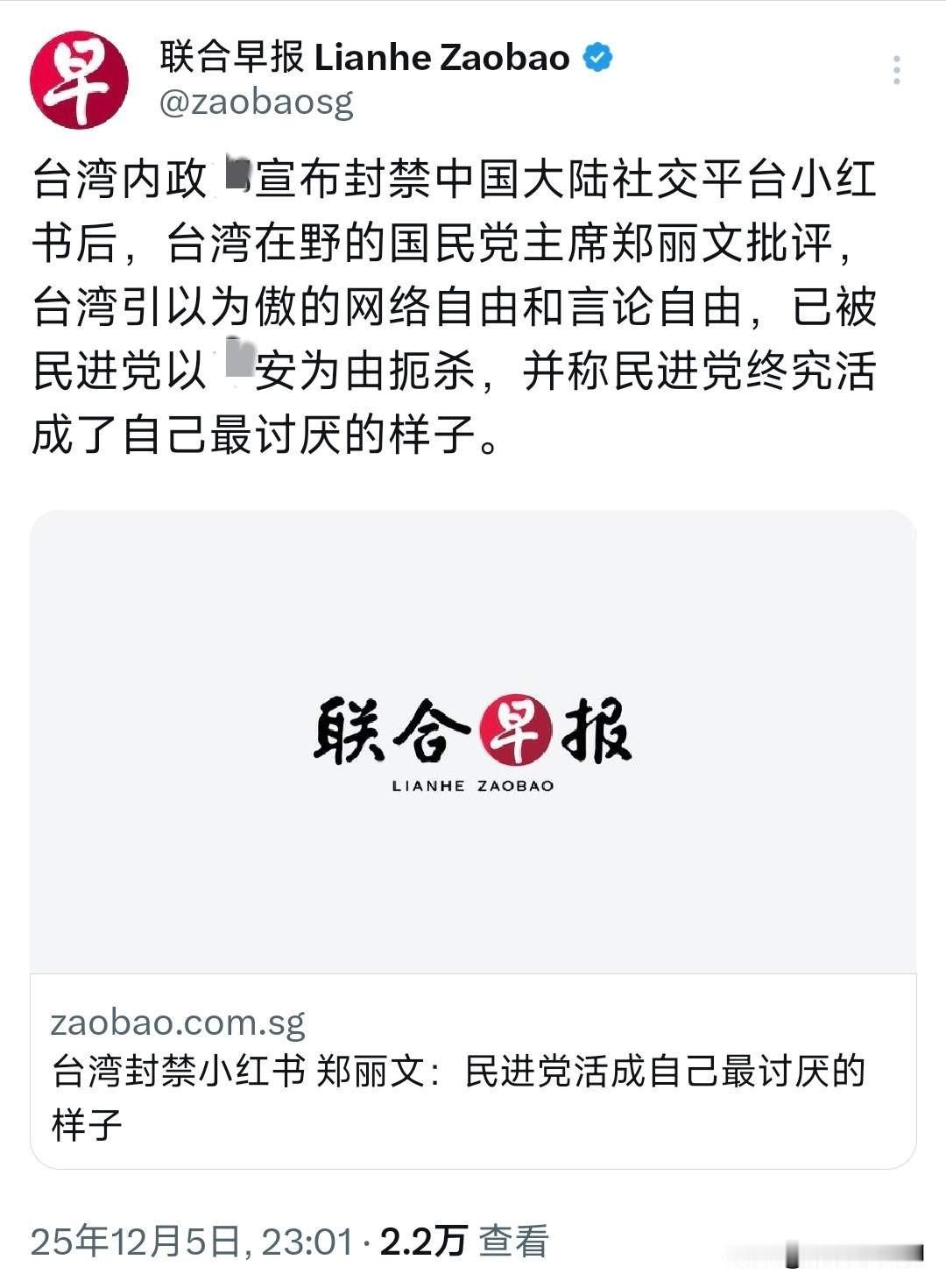 台湾省执政当局封禁小红书一年,引发朝野攻防大战,国民党主席郑丽文发声:民进党终于活成了它讨厌的样子。 我怎么感觉怪怪的,作为一款时尚和生活类的社交APP,小红书也没求着台湾同胞下载使用,拥有300万使用群体,也是台湾同胞的自交选择,小红书生产和传播的内容更因高度生活化,获得台湾年轻人的喜爱,有些人就是本身就的“绿化带”公民。 下载和使用小红书的群体,都有一种身份认同:都认为小红书是年轻和潮流的标签,无关蓝绿。正是这种意识形态极淡的使用体验,没成想成了蓝绿交锋的抓手。 也不着探究小红书被“台独汉奸”集团封禁的原因,就算是国民党在位,也难免被封禁的厄运,现在的国民党人以及讨厌民进党的其他政治人物如黄国昌等人,利用小红书大作文章,感觉很恶心!明独和暗独不过了是为了争取断粮的300万台青,却让小红书作他们的工具! 尤其是国民党的政客们,一方面对“台独”课纲表示理解和尊重,一方面,又装作“民意”的代言人,替小红书抱屈,真真是让人“叹服”!