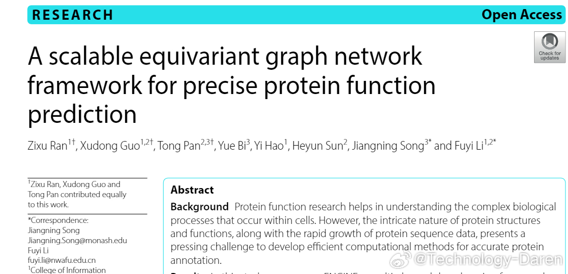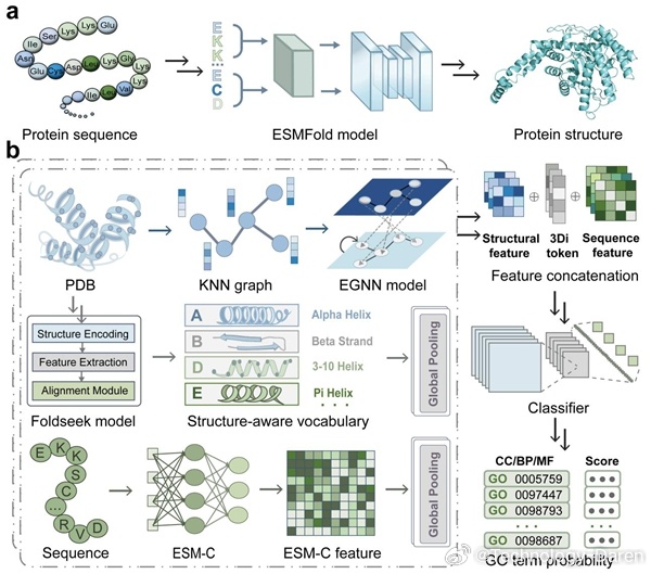科学家实现蛋白质功能精准注释 近日,西北农林科技大学信息工程学院智能计算与农业信息系统学科团队李富义教授课题组在蛋白质功能注释研究方面取得重要进展,研究成果以“A scalable equivariant graph network framework for precise protein function prediction”为题发表在《Genome Biology》。课题组硕士研究生冉子旭、博士研究生生郭旭东和澳大利亚Monash大学博士研究生潘彤为论文共同第一作者,李富义教授为通讯作者,澳大利亚Monash大学Jiangning Song教授为并列通讯作者。蛋白质功能研究有助于理解细胞内发生的复杂生物过程。然而,蛋白质结构与功能的复杂性,以及蛋白质序列数据的快速增长,使得开发高效计算方法进行精准蛋白质注释成为迫切挑战。该研究提出ENGINE多通道深度学习框架,旨在实现稳健的蛋白质功能预测。ENGINE采用等变图卷积网络捕捉蛋白质的三维结构特征,借助蛋白质大语言模型(ESM-C和Foldseek)提取进化信息和表征三维序列,实现空间结构与序列信息的统一整合。实验结果表明,ENGINE在蛋白质功能预测基准测试中超越现有方法,展现出强大的泛化能力与高预测精度。除性能优势外,ENGINE分析了可解释的关键结构特征,助力识别未注释的蛋白功能。同时,注意力机制的融入使ENGINE能精准定位参与多样化生物活性的关键残基,实现残基层面的功能注释。通过提供具有生物学可解释性的可靠预测,ENGINE为推进细胞过程和疾病机制的研究做出了贡献。为了便于研究人员轻松复现并拓展该工作,ENGINE已经开源,并在GitHub (网页链接) 和Zenodo (网页链接) 上提供配备了图形用户界面(GUI)的计算软件和源代码。此外,课题组面向校内用户提供批量计算服务。该研究得到了国家自然科学基金[62202388]、国家重点研发计划[2022YFF1000100]和秦创原创新创业人才项目[QCYRCXM-2022–230]的支持。最新科技消息 论文链接:网页链接 网页链接