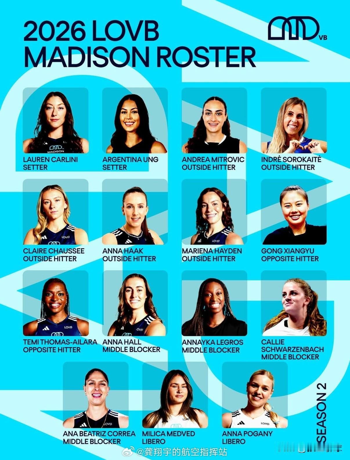 简直是不谋而合啊!今天下午我撰写了题为《龚翔宇留洋担负奥运特殊任务 首秀确定 球队介绍 比赛国内直播》(之前没有看到龚翔宇中午的发文),简要介绍了她所加盟的美国职业排球联赛(LOVB)的麦迪逊俱乐部以及几个重要球员,今天晚上看到龚翔宇自己中午发了球队球员图片和位置,具体情况如下: LOVBMADSION 大家来认识认识一下[吐舌] ▶️二传:🇺🇸卡里尼,🇲🇽翁 ▶️接应:🇨🇳龚翔宇,🇺🇸艾拉拉 ▶️主攻:🇨🇦米特罗维奇,🇮🇹索罗凯特,🇺🇸肖塞,🇸🇪A.哈克,🇺🇸海登 ▶️副攻:🇺🇸霍尔,🇺🇸勒格罗斯,🇺🇸施瓦茨巴赫,🇧🇷比亚 ▶️自由人:🇷🇸梅德韦德,🇩🇪波加尼