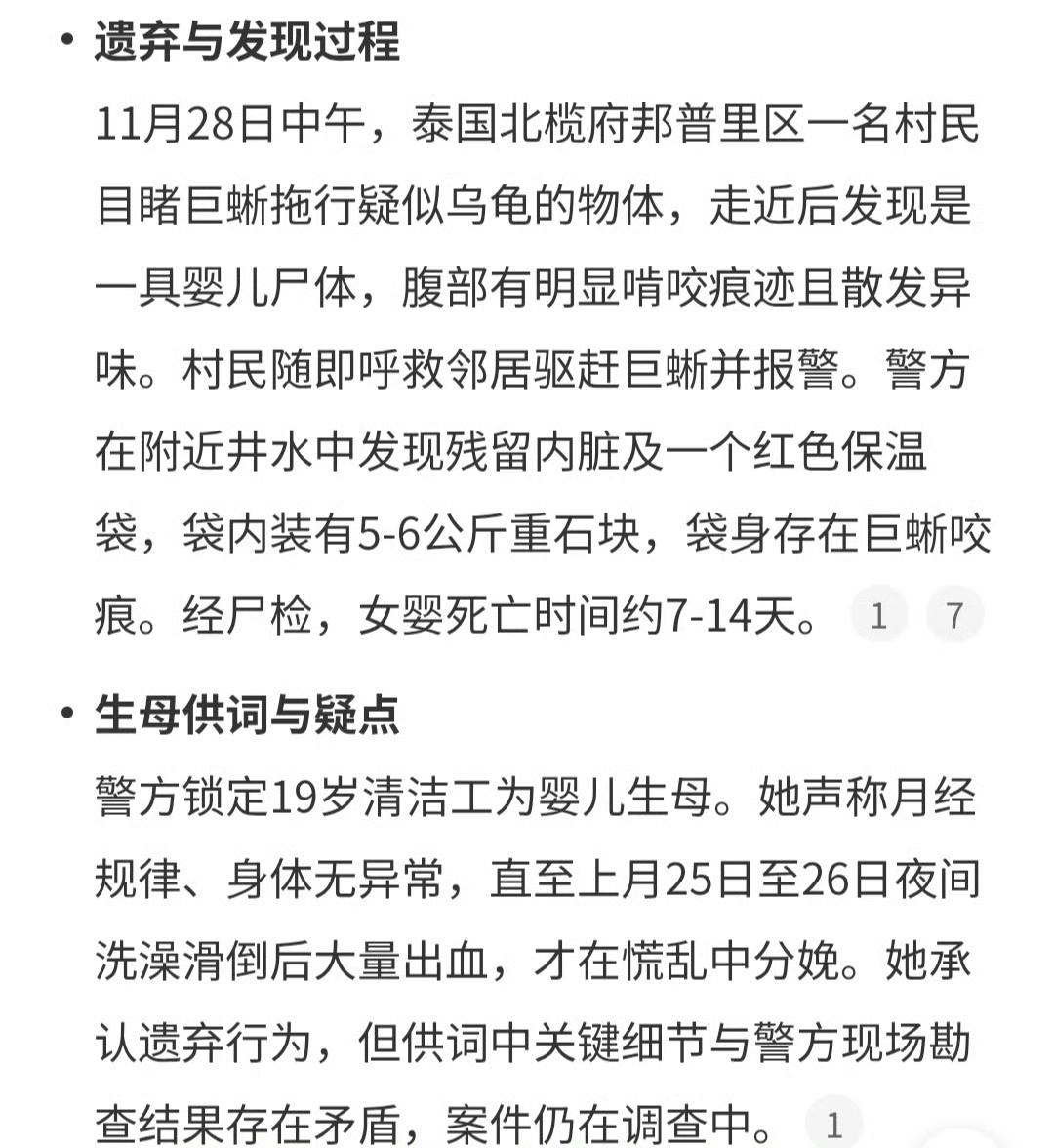 在泰国一个村子边上,发生了一件让人看了心都揪起来的事。有天中午,一个大叔在家门口扔垃圾,远远看见一只大个儿的巨蜥,正拖着个东西在地上走,他一开始还以为是只乌龟,结果走近一瞧,差点没吓瘫在地——那哪是乌龟,分明是个刚出生没多久的婴儿,身上还有被啃过的痕迹。他吓得赶紧喊来邻居,一群人合力把那只巨蜥赶跑了,然后立刻报了警。 警察和法医很快赶到现场,经过检查,确认这个婴儿是个刚出生的女婴,肚子上有明显的咬伤,身体已经开始发臭,估计死了有一段时间了。更让人心里发毛的是,警方在附近的一口井里,发现了婴儿的内脏,还捞上来一个红色的保温袋,袋子里面居然塞了块好几公斤重的大石头,袋子上还有巨蜥咬过的牙印。这说明,有人把孩子装进袋子,绑上石头扔进了井里,可能是想沉底,但袋子后来破了,孩子被冲出来,才被巨蜥拖走。 顺着线索查下去,警察很快找到了孩子的亲生母亲,是个才19岁的年轻姑娘,在一家公司做清洁工。她面对警察时说,自己根本不知道自己怀孕,平时月经很正常,身体也没啥异常,一直到那天晚上洗澡时突然滑倒,屁股着地,然后就开始大出血,稀里糊涂就把孩子生了下来。她说自己吓坏了,完全不知道该怎么办,就把孩子处理掉了。 这话听起来是挺离奇的,很多人第一反应就是:怎么可能不知道自己怀孕?但医学上确实有“隐性怀孕”这种说法,就是有些人孕期反应特别轻,肚子也不怎么显怀,加上心理因素或者身体原因,真的会察觉不到。不过,她这番说辞虽然听起来有那么点可能,但和现场发现的很多细节对不上,比如那个装了大石头的保温袋,明显是经过一番准备的,不是一时慌乱能做出来的。所以目前警方还在深入调查,她也已经被控制,案件还没完。 这事一出来,网上炸了锅。有人骂她冷血,生了孩子不送医不报警,反而狠心丢掉,太没人性;也有人觉得她可能太年轻,害怕、无助,一时犯了错。但不管怎么说,一个刚来到世界的小生命,还没来得及睁眼看一眼,就被亲生母亲抛弃,最后还被野兽啃食,这结局真的太惨了。很多人看到巨蜥拖婴儿的照片,整晚都睡不着。 这事儿也不只是个案那么简单,它背后其实暴露了很多问题。比如对年轻女性的性教育够不够,怀孕了能不能得到及时帮助,社会有没有给那些走投无路的孕妇留一条出路。在一些地方,未婚先孕还是件特别丢脸的事,女孩怕被家人骂、被社会歧视,只能选择隐瞒,最后酿成悲剧。如果她生下孩子后能有人帮一把,而不是只能一个人面对恐惧和压力,也许结局就会不一样。 来源:潇湘晨报