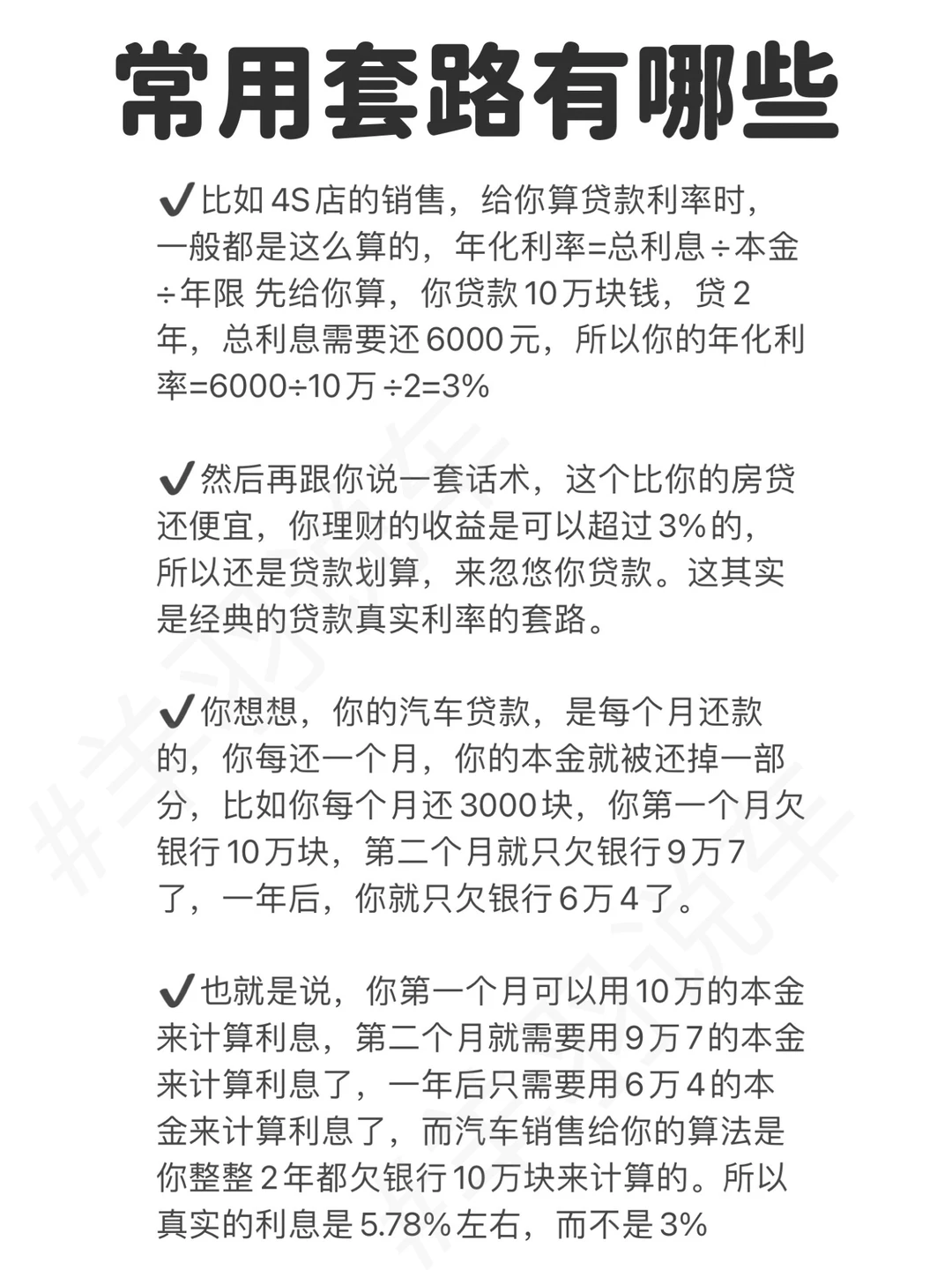 ✔️比如4S店的销售,给你算dk利率时,一般都是这么算的,年化利率=总利息÷本金÷年限。然后给你算,你dk10万,贷2年,总利息需要还6000元,所以你的年化利率=6000÷10万÷2=3%