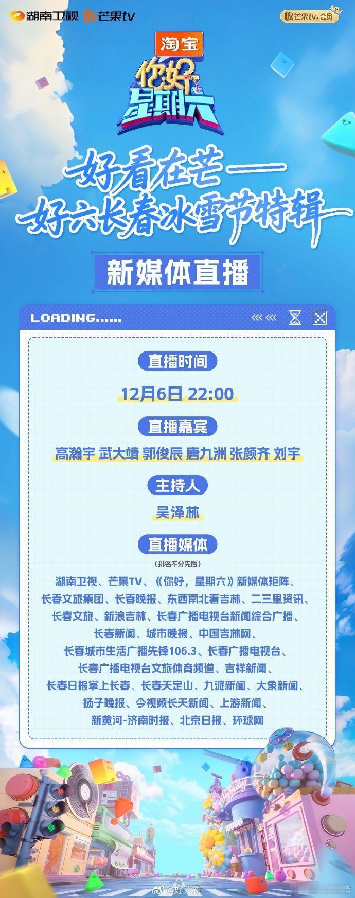 你好星期六滑雪直播你好星期六 哇哦!hi6长春特辑今晚开播咯!高瀚宇、武大靖、郭俊辰、唐九洲、张颜齐、刘宇、吴泽林组成的“冰6团”,在早市、雪场、街巷、乐园开启欢乐之旅。22:00记得看,精彩不容错过!你好星期六