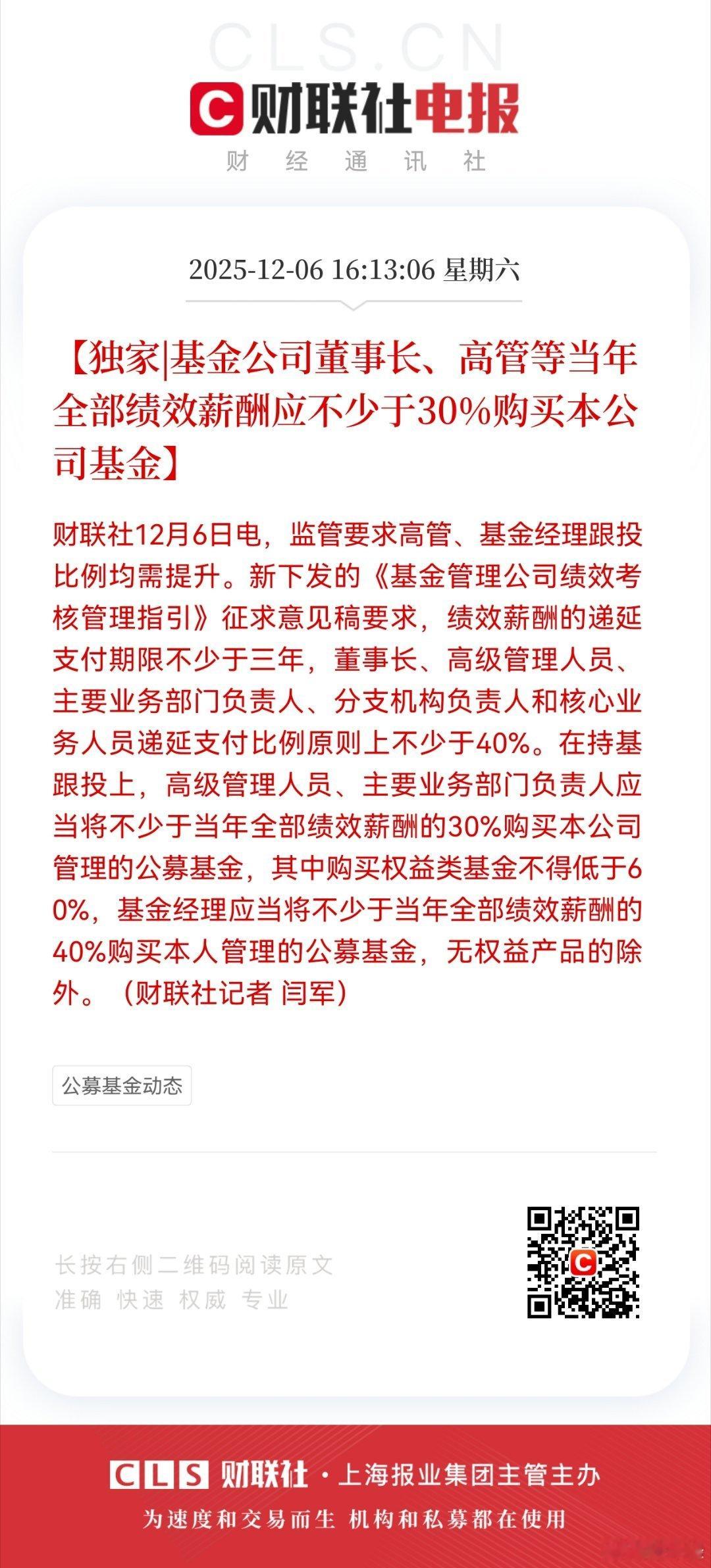 【独家|基金公司董事长、高管等当年全部绩效薪酬应不少于30%购买本公司基金】财联社12月6日电,监管要求高管、基金经理跟投比例均需提升。新下发的《基金管理公司绩效考核管理指引》征求意见稿要求,绩效薪酬的递延支付期限不少于三年,董事长、高级管理人员、主要业务部门负责人、分支机构负责人和核心业务人员递延支付比例原则上不少于40%。在持基跟投上,高级管理人员、主要业务部门负责人应当将不少于当年全部绩效薪酬的30%购买本公司管理的公募基金,其中购买权益类基金不得低于60%,基金经理应当将不少于当年全部绩效薪酬的40%购买本人管理的公募基金,无权益产品的除外。(财联社记者 闫军)