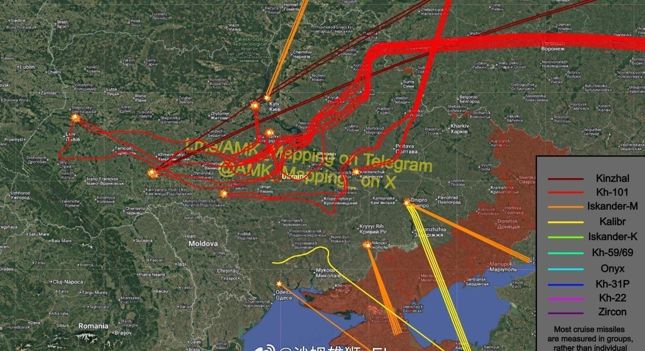 当地时间昨天晚上至今天中午,俄罗斯对乌克兰发动新一轮大规模空袭,情况如下。 导弹发射总数为59枚:4没钱“匕首”高超声速导弹、12枚“伊斯坎德尔-M”弹道导弹、38枚Kh-101巡航导弹和5枚“口径”巡航导弹。其中,4枚Kh-101巡航导弹、2枚“口径”高超声速导弹和1枚“伊斯坎德尔-M”弹道导弹被乌军防空部队击落。今天的拦截率较高,超过了10%,可能与袭击时间跨度较长有关。 无人机的发射总数大约为数百枚,乌军防空战报给的数字是653架,按照惯例应当是略夸大的数字。 导弹打击的目标: · 利沃夫州多布罗特维尔热电厂(坐标:50.21385, 24.37655),遭约8枚Kh-101袭击。 · 基辅州"基辅"750千伏变电站(坐标:50.49363, 29.69296),遭约5枚Kh-101和约1枚"匕首"袭击。 · 基辅州"北部"330千伏变电站(坐标:50.61302, 30.38289),遭约3枚"伊斯坎德尔-M"袭击(其中1枚在接近时被击落)。 · 第聂伯罗彼得罗夫斯克州包含多座150千伏变电站的工业区(坐标:48.48005, 34.99807),遭约4枚"口径"和约2枚"伊斯坎德尔-M"袭击(1枚"口径"在第聂伯市上空被击落)。 · 第聂伯罗彼得罗夫斯克州克里维里赫热电厂(坐标:47.54282, 33.65892),遭约5枚"伊斯坎德尔-M"袭击。 · 敖德萨州"阿贾利克"330千伏变电站(坐标:46.69939, 30.93175),遭约1枚"伊斯坎德尔-M"袭击。 · 赫梅利尼茨基州南部未知目标,遭约6枚Kh-101和约3枚"匕首"袭击。 · 基辅州白采尔克维东北部未知目标,遭约5枚Kh-101袭击。 · 第聂伯罗彼得罗夫斯克州第聂伯市东南部未知目标,遭约1枚"伊斯坎德尔-M"袭击。 · 文尼察州拉迪任热电厂(坐标:48.70562, 29.21877)遭约4枚Kh-101袭击。 · 波尔塔瓦州克列缅丘克市内/附近未知目标(可能与能源相关)遭约4枚Kh-101袭击。 "天竺葵-2"无人机单独袭击的地点列表: 基辅市、法斯蒂夫、白采尔克维、维什哥罗德、卢茨克市、卢茨克市附近未知区域、波尔塔瓦市、第聂伯罗彼得罗夫斯克州杜博维基/梅迪奇内、巴甫洛格勒、第聂伯罗彼得罗夫斯克州沙赫塔尔斯克地区、第聂伯罗彼得罗夫斯克州彼得罗巴甫洛夫卡地区、第聂伯罗彼得罗夫斯克州瓦西里基夫卡、切尔尼戈夫市、切尔尼戈夫州科留科夫卡附近多个未知定居点、顿涅茨克州克拉马托尔斯克附近地区、扎波罗热市附近地区、赫梅利尼茨基州舍佩蒂夫卡、利沃夫市、利沃夫州西莱茨、利沃夫州斯特雷地区、利沃夫州舍普季茨基地区、利沃夫州布斯克地区、文尼察州拉迪任、罗夫诺州未知区域、敖德萨州皮夫登内、哈尔科夫州诺韦、哈尔科夫州伊久姆、哈尔科夫州科罗布奇内、哈尔科夫州马尔蒂尼夫卡地区、尼古拉耶夫州沃兹涅先斯克地区、切尔卡瑟州佐洛托诺沙地区。 此外,俄军还对扎波罗热市以南、扎波罗热州兹纳奇科沃附近(750千伏变电站)以及赫尔松市的能源基础设施进行了多管火箭炮和火炮打击。
