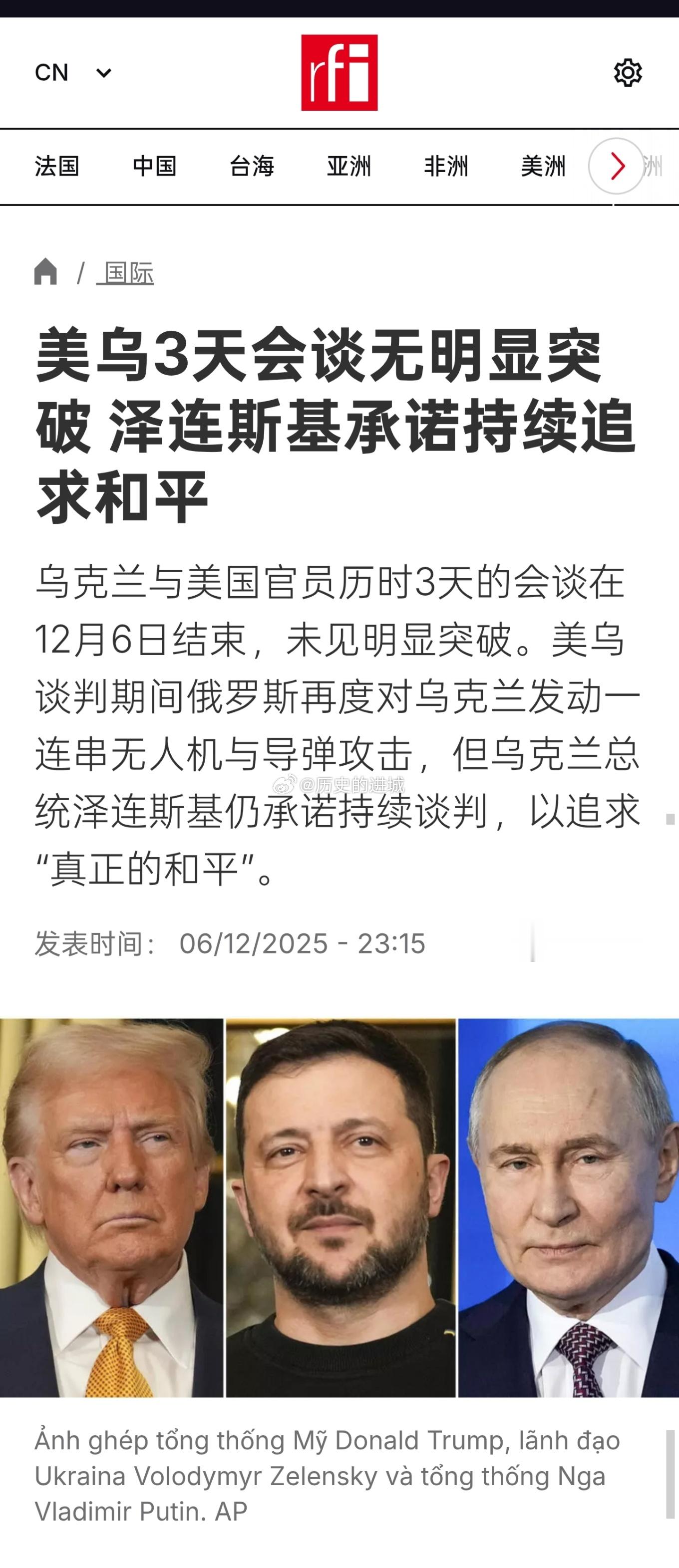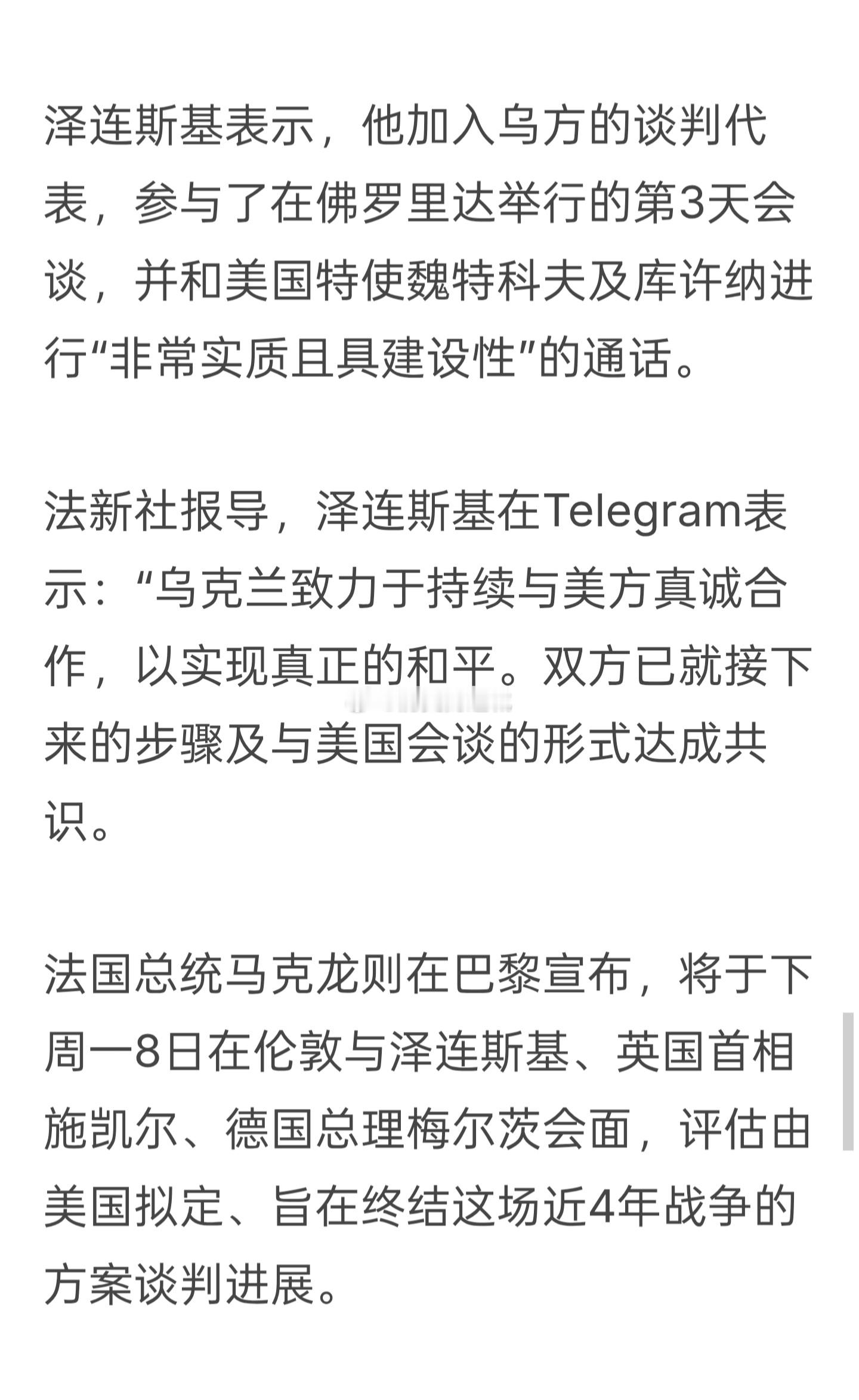 乌克兰与美国官员历时3天的会谈在12月6日结束,未见明显突破。泽连斯基表示,他加入乌方的谈判代表,参与了在佛罗里达举行的第3天会谈,并和美国特使魏特科夫及库许纳进行“非常实质且具建设性”的通话。泽连斯基表示:“乌克兰致力于持续与美方真诚合作,以实现真正的和平。双方已就接下来的步骤及与美国会谈的形式达成共识。法国总统马克龙宣布,将于下周一8日在伦敦与泽连斯基、英国首相施凯尔、德国总理梅尔茨会面,评估由美国拟定、旨在终结这场近4年战争的方案谈判进展。