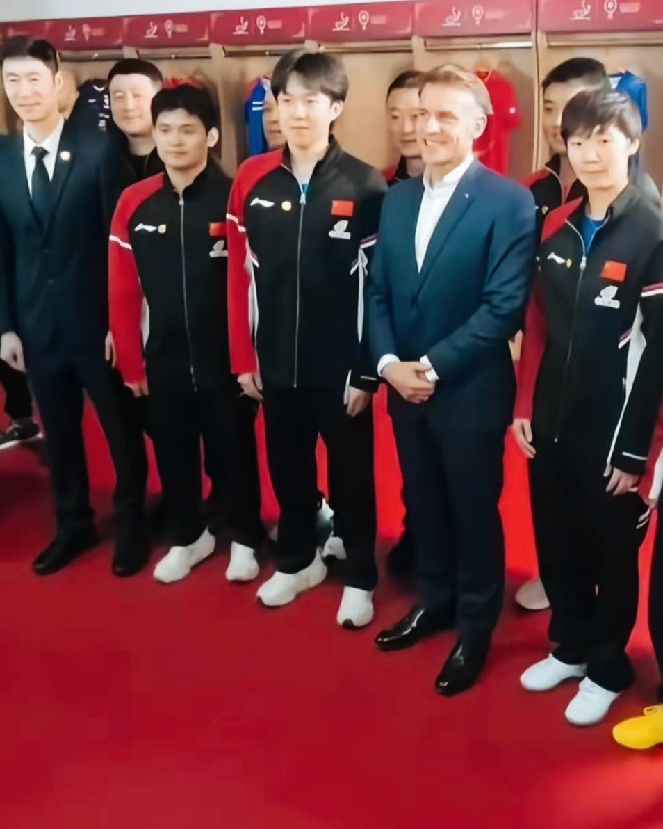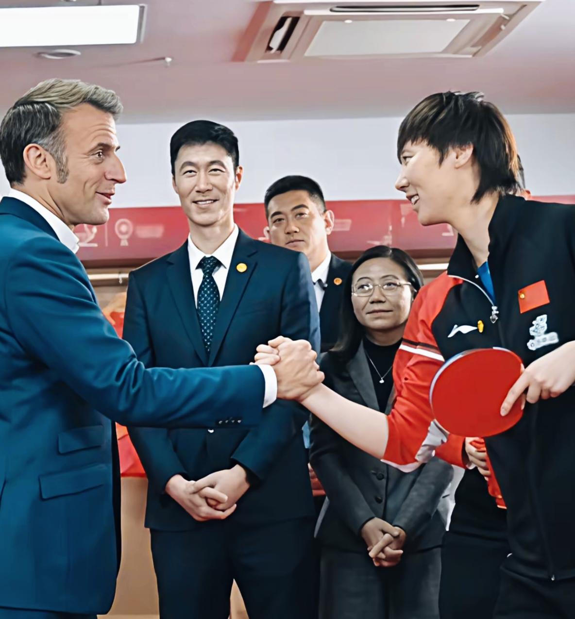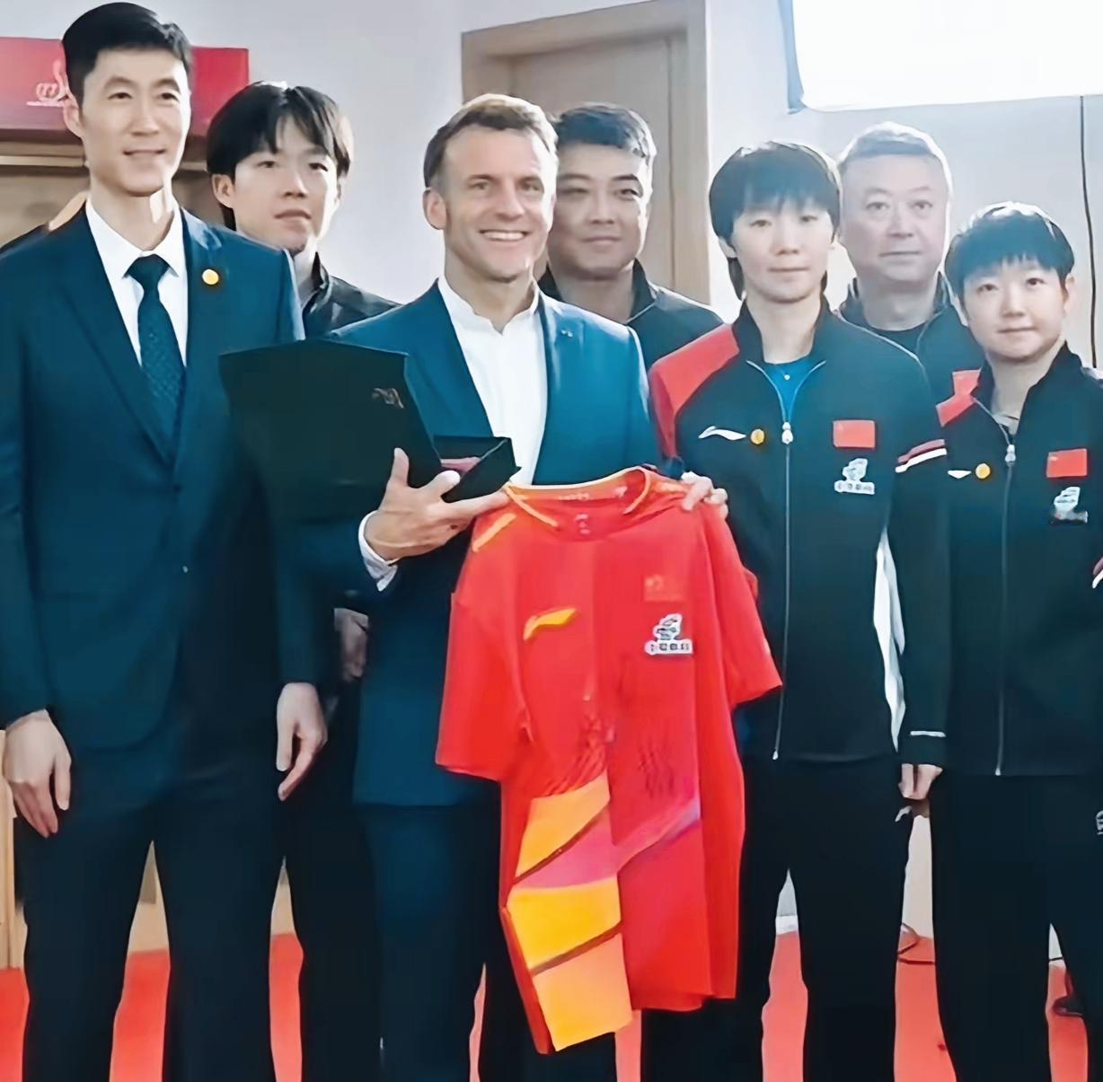 马克龙笑的这么开心啊! 马克龙是不是感觉追星成功了啊? 可以跟这么厉害顶尖的乒乓球运动员切磋球技,太难得了吧! 还得到了这么多顶尖球员签名球衣!