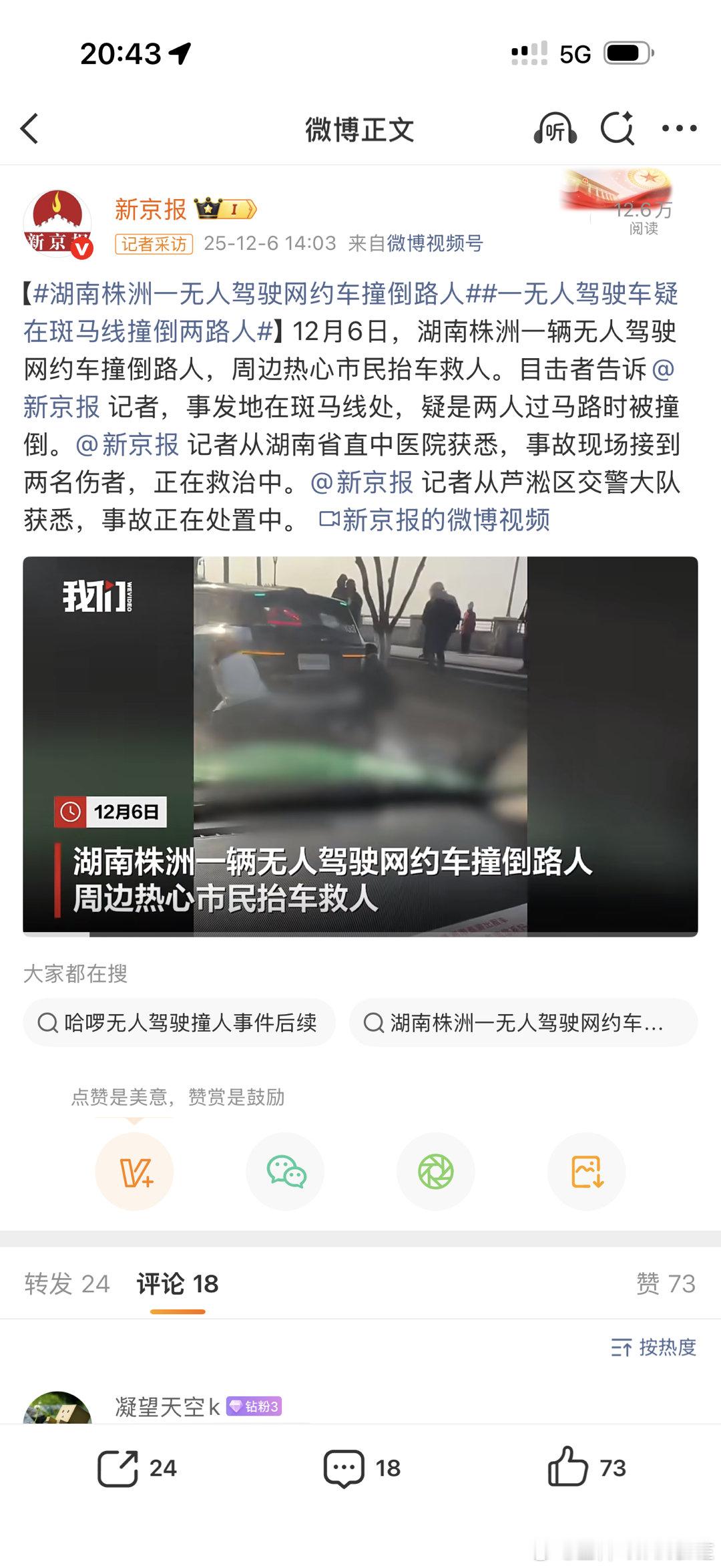 湖南株洲一无人驾驶网约车撞倒路人 最不想看到的事情还是发生了!希望人没事!等待判责结果!