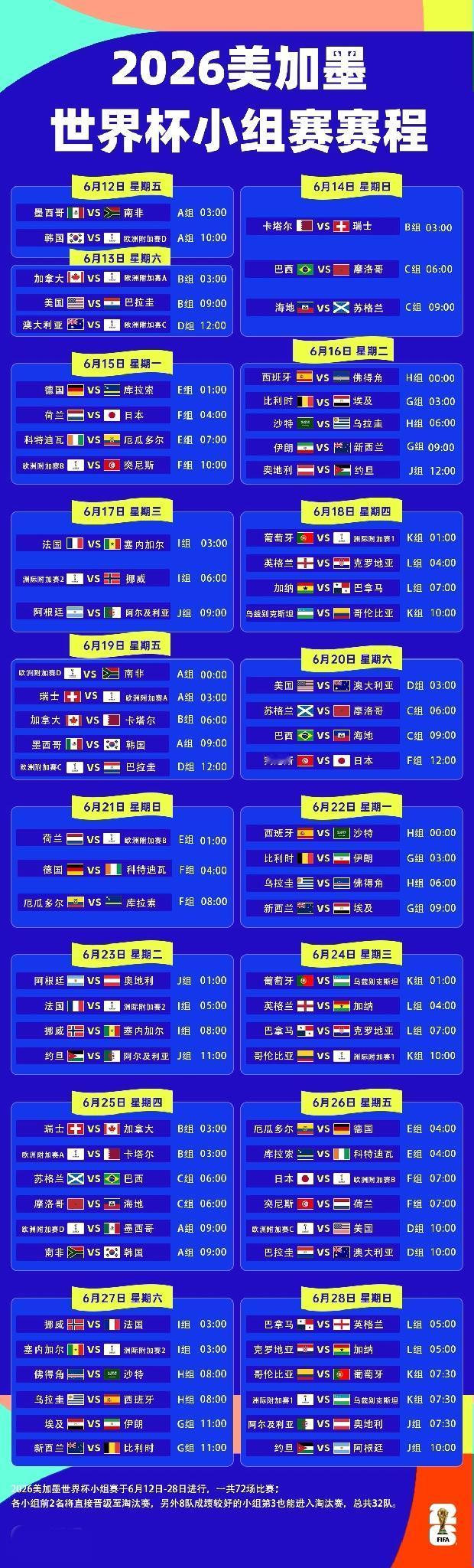 2026世界杯小组赛赛程出炉:揭幕战6月12日3点,阿根廷6月17日9点首战阿尔及利亚 12月7日,2026美加墨世界杯赛程正式出炉,小组赛一共72场比赛,本届揭幕战将在6月12日凌晨3点打响,墨西哥vs南非!阿根廷首战6月17日9点对战阿尔及利亚,哥伦比亚对阵葡萄牙6月28日星期日 07:30,挪威对阵法国的焦点战将在6月27日3点进行