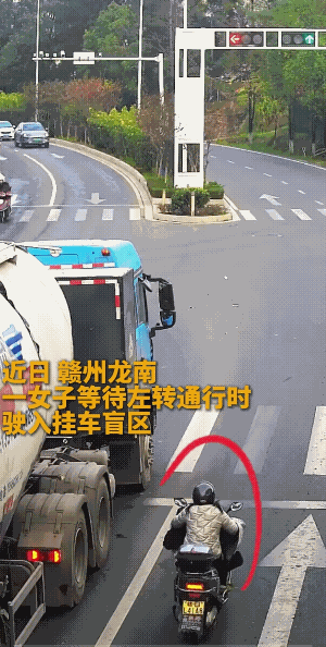 她知道她的身旁是大车,她也知道她距离这个大车太近了。可她认为大车是能看到她的,她还认为她不走,大车也是不能走的。可她不知道她停的这个位置是大车的肓区,也不知道若发生碰撞那就是鸡蛋碰石头。 还好!她只是受到惊吓,也是万幸中的万幸。