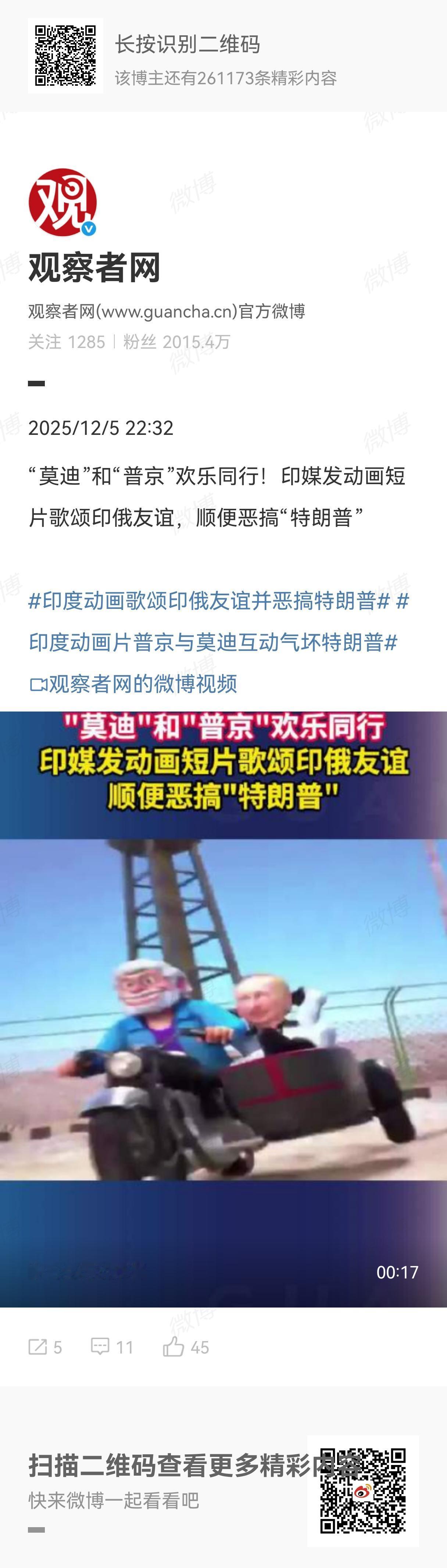 相信这几天大家应该看过印度网友制作对象动画视频,欢迎普京总统到访印度。动画片里面,莫迪总理和普京总统同驾一辆摩托车,强调了莫迪和普京兄弟情深,彰显了印度和俄罗斯的友谊。画面中有个镜头就是摩托车跑到加油站去转了一圈,特朗普总统拿着加油枪转了几圈,结果两人驾着摩托车扬长而去,估计特朗普总统看到视频牙齿都会咬碎。看了动画片,还怪欣赏印度人的,简直时刻把“大篷车”精神刻在基因里面:管你高兴不高兴,我先高兴了再说;管你喜欢不喜欢,我自己先爽了再说。