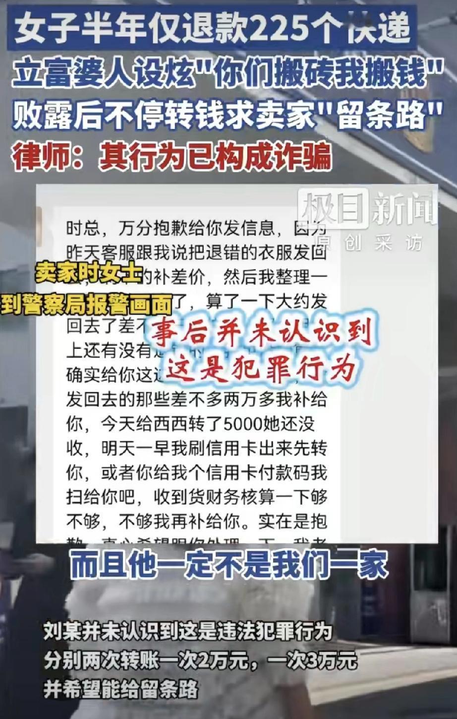真是活久见!半年时间,用6个账号在同一家店“仅退款”331单,骗走225个快递,总价5万多……这操作也太“执着”了。 山东烟台这位刘某,每次下单都买一堆东西,贵的便宜的都有。快递还在路上,她就申请仅退款,把贵的东西“拦截”下来。这还没完,她居然用吹风机把面单吹下来,调包换成便宜货再退回去!要不是最近有一次没贴好面单露了馅,商家时女士还蒙在鼓里。 更绝的是,她把骗来的东西放在二手平台和粉丝群卖,还天天在群里炫富,营造“富婆”人设。有人翻出她以前的朋友圈,居然发过“你们在搬砖,我在搬人民币”这种话……现在看真是讽刺。 事情败露后,她倒是迅速转了5万块想私了,还说老公去世、自己带孩子,求商家“留条路”。但时女士态度很坚决:“不接受道歉,已报警。” 律师说了,这种一开始就没打算付钱、虚构事实骗货变现的行为,已经构成诈骗。目前警方已经受理了案件。 就想问一句:早知今日,何必当初呢?踏实过日子不好吗? 网购退货骗局 仅退款应对策略 仅退款骗局 淘宝诈骗 网购退款陷阱 仅退款电商 仅退款 社会百态 网购陷阱