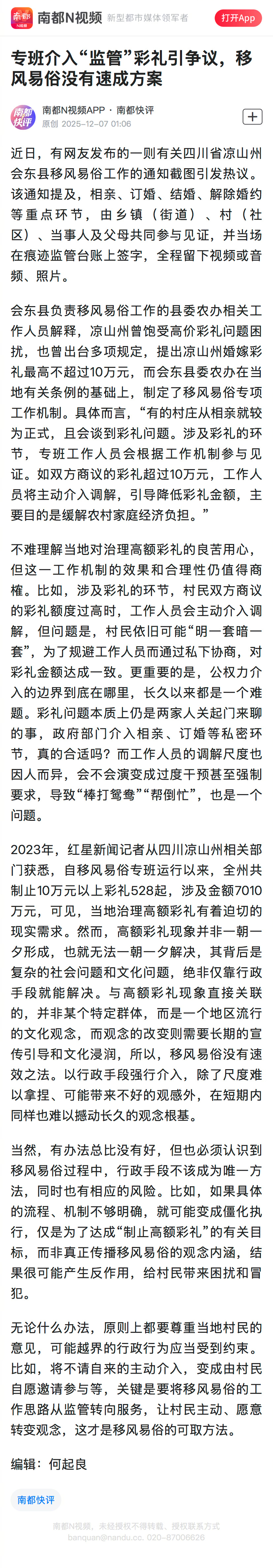 【南都快评:专班介入“监管”彩礼引争议,#移风易俗没有速成方案#】#公权力介入彩礼协商边界在哪#近日,有网友发布的一则有关四川省凉山州会东县移风易俗工作的通知截图引发热议。该通知提及,相亲、订婚、结婚、解除婚约等重点环节,由乡镇(街道)、村(社区)、当事人及父母共同参与见证,并当场在痕迹监管台账上签字,全程留下视频或音频、照片。#专班介入监管彩礼引争议#会东县负责移风易俗工作的县委农办相关工作人员解释,凉山州曾饱受高价彩礼问题困扰,也曾出台多项规定,提出凉山州婚嫁彩礼最高不超过10万元,而会东县委农办在当地有关条例的基础上,制定了移风易俗专项工作机制。具体而言,“有的村庄从相亲就较为正式,且会谈到彩礼问题。涉及彩礼的环节,专班工作人员会根据工作机制参与见证。如双方商议的彩礼超过10万元,工作人员将主动介入调解,引导降低彩礼金额,主要目的是缓解农村家庭经济负担。”不难理解当地对治理高额彩礼的良苦用心,但这一工作机制的效果和合理性仍值得商榷。比如,涉及彩礼的环节,村民双方商议的彩礼额度过高时,工作人员会主动介入调解,但问题是,村民依旧可能“明一套暗一套”,为了规避工作人员而通过私下协商,对彩礼金额达成一致。更重要的是,公权力介入的边界到底在哪里,长久以来都是一个难题。彩礼问题本质上仍是两家人关起门来聊的事,政府部门介入相亲、订婚等私密环节,真的合适吗?而工作人员的调解尺度也因人而异,会不会演变成过度干预甚至强制要求,导致“棒打鸳鸯”“帮倒忙”,也是一个问题。