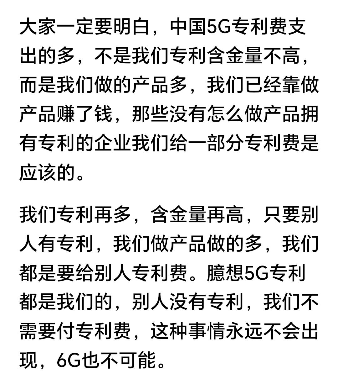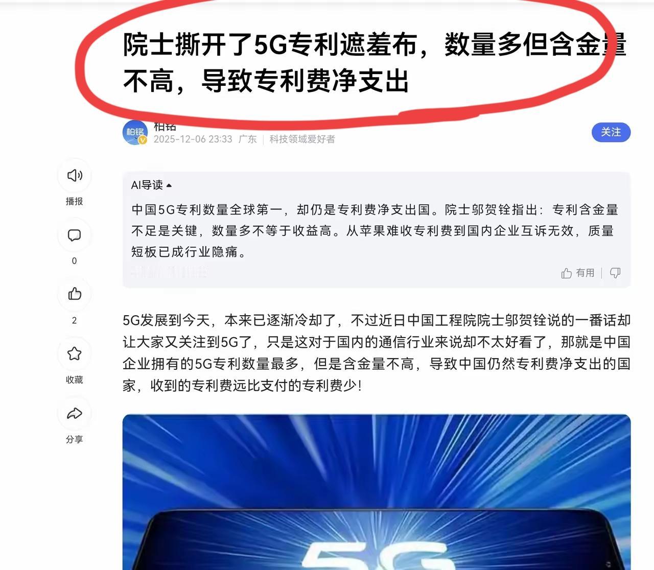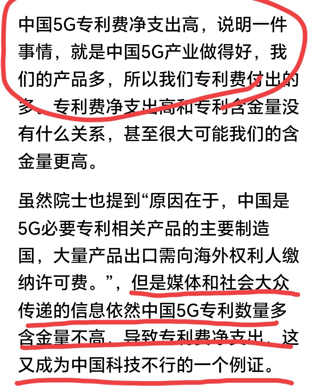 看看,这就是中专生项立刚和院士及媒体人的区别。同样都是5G专利费中国净支出全球最高的事情, 媒体人得出的结论就是5G专利遮羞布被撕开,数量多含金量不高,所以中国科技其实还是不行。 这就是他们的结论。 项立刚却看到的是中国的5G产品多,产品多付出的专利费就更多。 用数据说话,中国生产5G手机全球占比60-70%,5G基站全球占比7成。 做一个简单计算,在中国必要专利总数和全球其他国家总和相等的情况下,中国要付出专利费总额肯定也是全球第一啊。 很明显,项立刚讲的更客观更接近事实的真相啊。而这些媒体报道为了吸引眼球根本就没有去了解事情的真相,这样写出来的新闻有公信力吗? 媒体人为什么容易出公知,因为屁股坐歪了。不是让你一定要吹捧我们自己好,是让你要客观实事求是看问题。 但有些人把贬低中国吹捧西方当客观。 那些学新闻的大学高材生们出来干的活儿真不如项立刚一个中专生的自媒体。 点右上角关注我,我们一起去看这个魔幻的世界