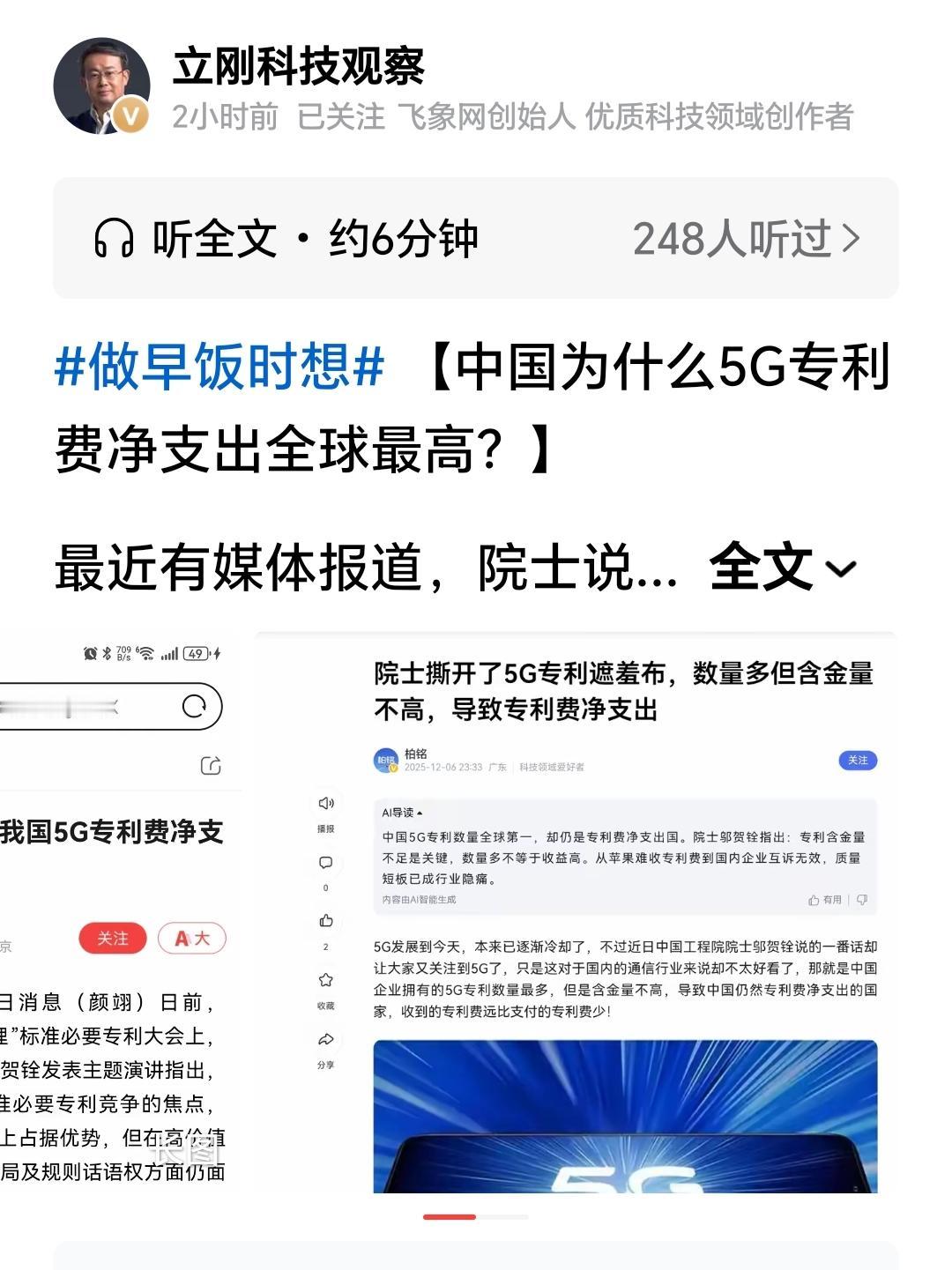看看,这就是中专生项立刚和院士及媒体人的区别。同样都是5G专利费中国净支出全球最