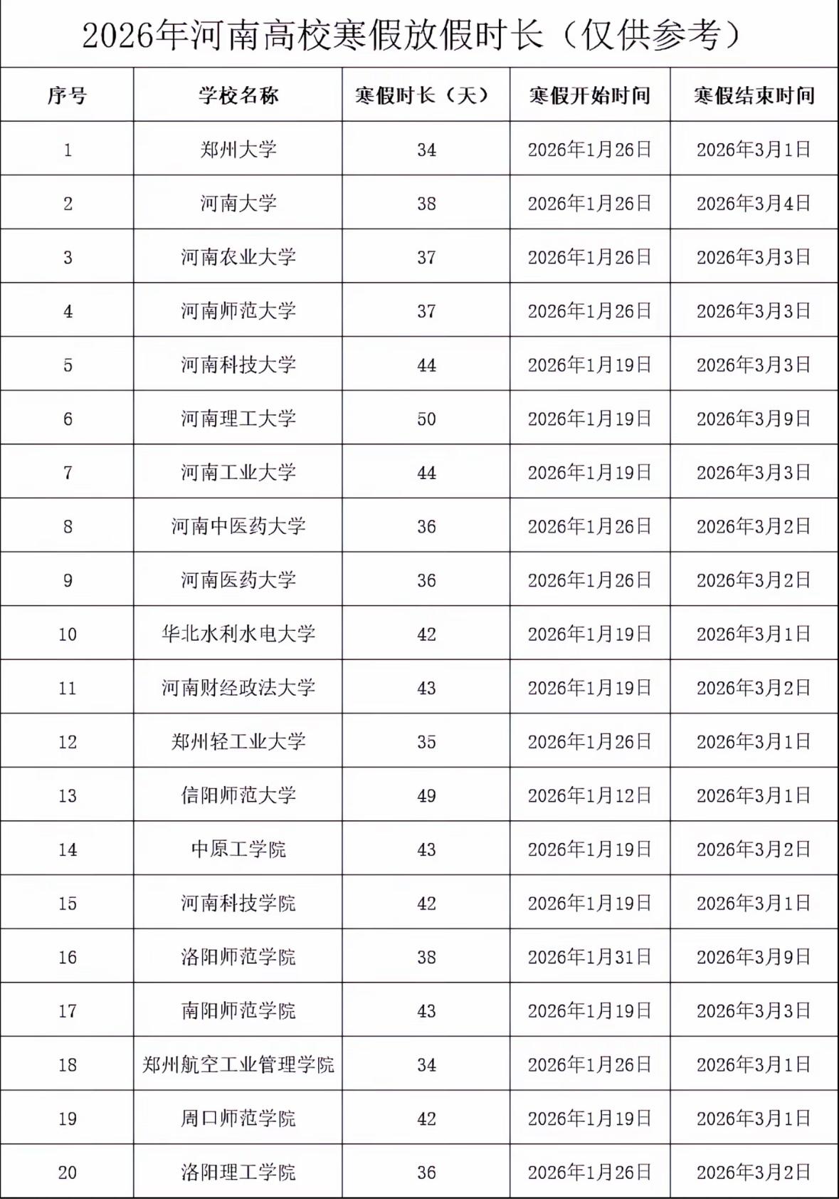 2026年河南高校寒假天数参考版,郑州大学寒假拟定时长34天,1月26号放假3月1日开学,河南大学放假天数38天,1月26号放假3月4号开学。寒假天数超40天的有10所高校,其中河南理工大学寒假拟定50天,1月19号放假3月9号开学,第二名信阳师范大学寒假天数49天。今年特殊寒假较长,部分民办高校本科和公办专科寒假天数或将超过2个月。