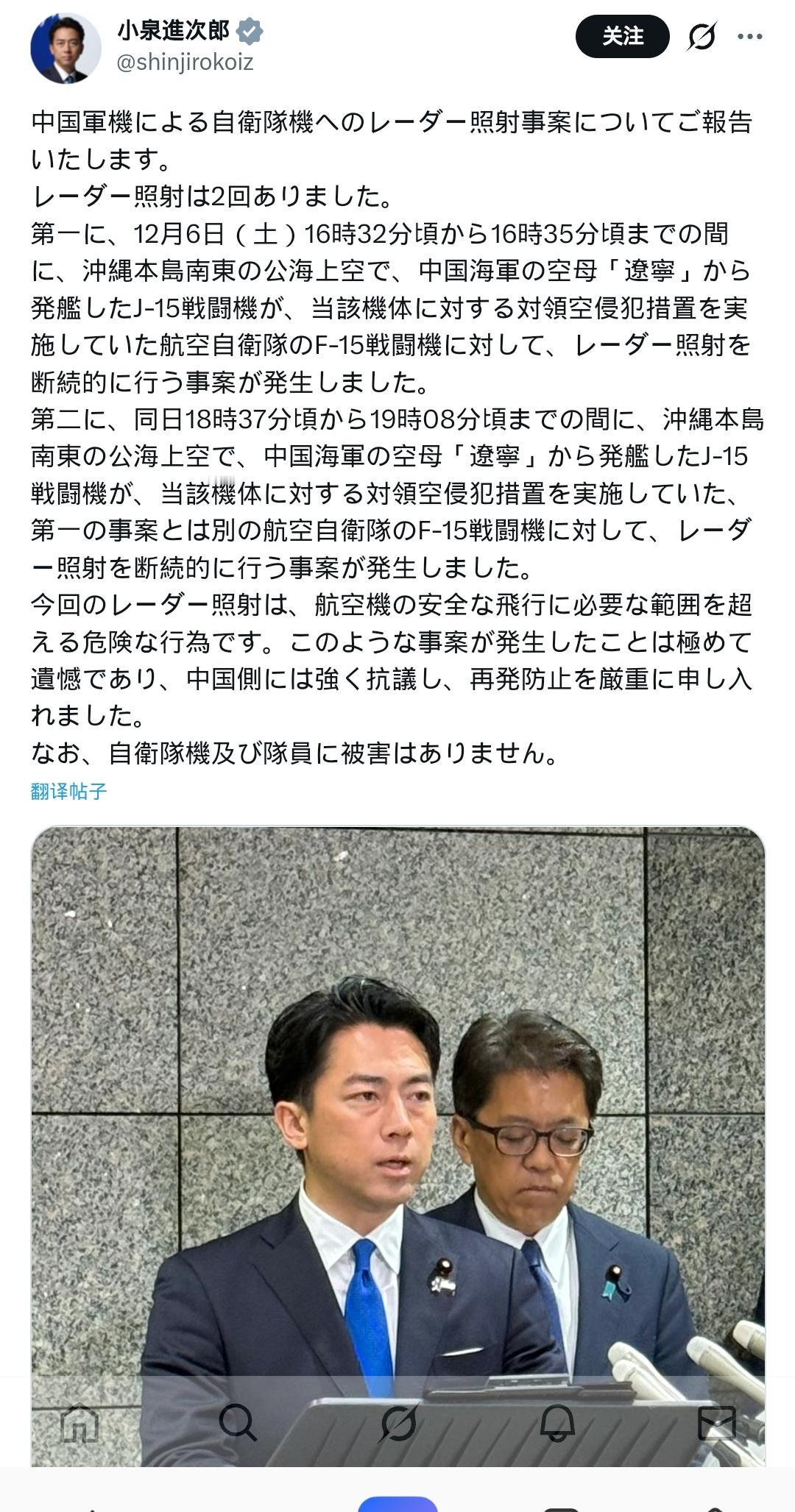 日本自卫队发这是在抽小泉脸吗! 小泉说我们有“侵·犯·”JP领空。 很显然,从自卫队发的动态看,辽宁舰战斗编队包括055南昌舰(101)、052D西宁舰(117)、052DG开封舰(124)先在琉球以西海域进行舰载战斗机起降,然后向东南方向穿过冲绳本岛与宫古岛之间的海域,到琉球东面海域,进行了舰载战斗机和舰载直升机起降。 整个海上活动区域,都属于国际公海。 是日本F-15自己贴脸过来,被雷达锁定,吓尿跑了。 Source: X
