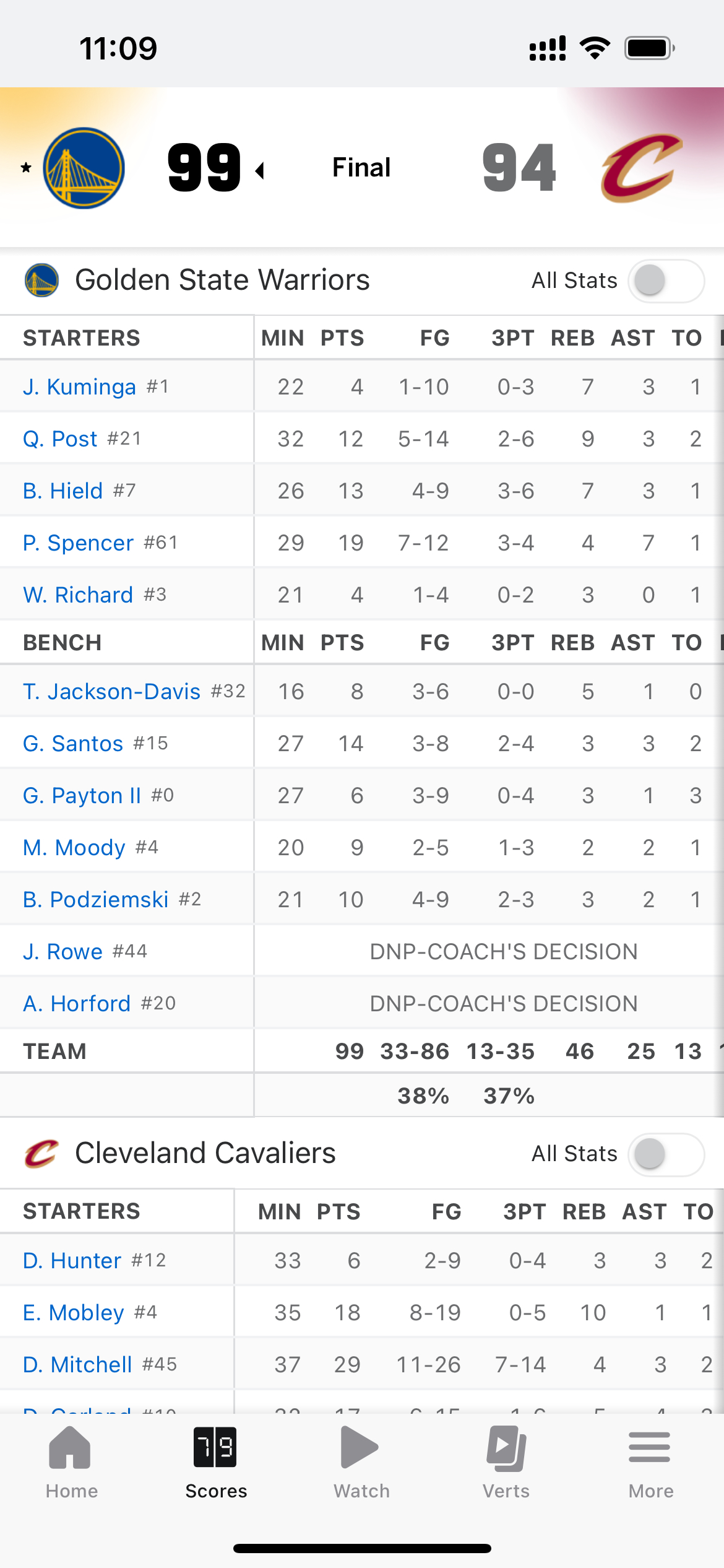 终于赢了!故事的结尾很完美,GOAT关键罚球全中,并向骑士球迷say goodbye,本场比赛Goat得到19分7助攻,均是全队最高,这可是他职业生涯首场比赛先发谢谢大家的拼抢,桑托斯今天很亮眼,波斯特的进攻也很重要,波杰姆斯基今天也有关键发挥,小佩顿的几次空切很好,TJD也抢的不错,希尔德的三分回来了,穆迪和理查德也有贡献,总之是一场全员的胜利,拼抢和防守是现在这支勇士的立命之本!继续加油吧,这场胜利太重要了!